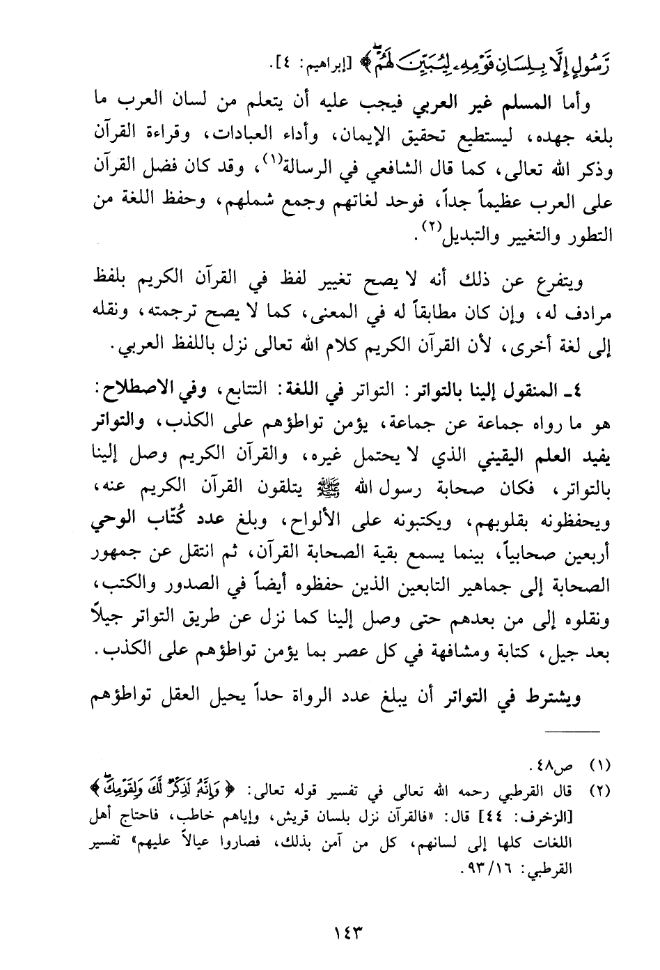 (٢) قال القرطبي رحمه الله تعالى في تفسير قوله تعالى: {وَإِنَّهُ لَذِكْرٌ لَكَ وَلِقَوْمِكَ} [الزخرف: ٤٤] قال: "فالقرآن نزل بلسان قريش، وإياهم خاطب، فاحتاج أهل اللغات كلها إلى لسانهم، كل من آمن بذلك، فصاروا عيالًا عليهم" تفسير القرطبي: ١٦/ ٩٣.