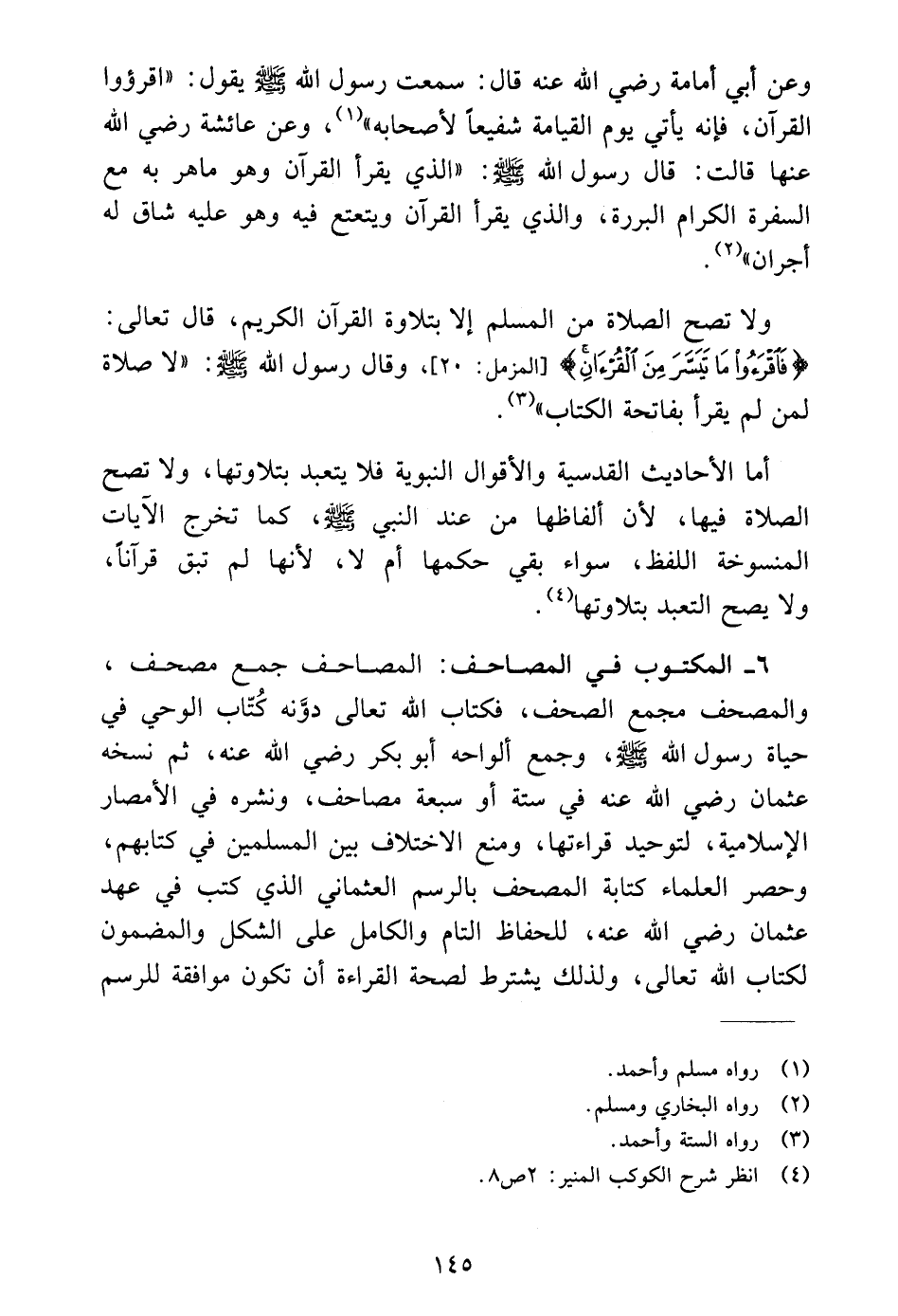 ولا تصح الصلاة من المسلم إلا بتلاوة القرآن الكريم، قال تعالى: {فَاقْرَءُوا مَا تَيَسَّرَ مِنَ الْقُرْآنِ} [المزمل: ٢٠] وقال رسول الله - صلى الله عليه وسلم -: "لا صلاة لمن لم يقرأ بفاتحة الكتاب" (٣).