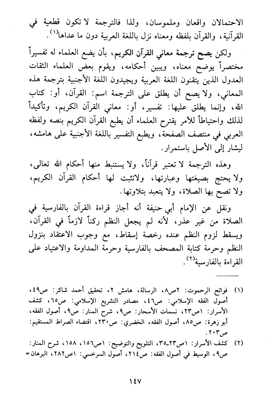 ونقل عن الإِمام أبي حنيفة أنه أجاز قراءة القرآن بالفارسية في الصلاة من غير عذر؛ لأنه لم يجعل النظم ركنًا لازمًا في القرآن، ويسقط لزوم النظم عنده رخصة إسقاط، مع وجوب الاعتقاد بنزول النظم وحرمة كتابة المصحف بالفارسية وحرمة المداومة والاعتياد على القراءة بالفارسية (٢).