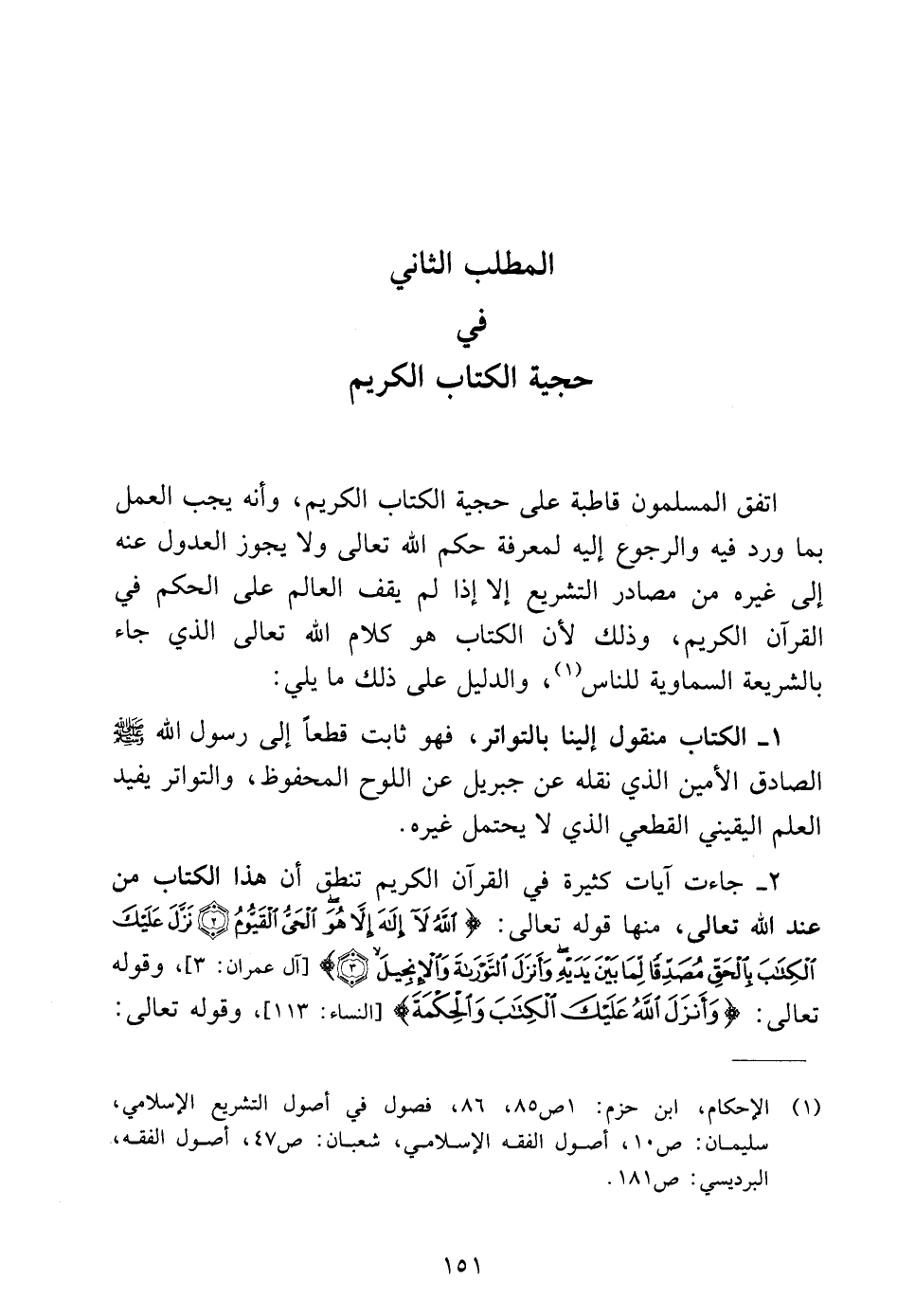 (١) الإحكام، ابن حزم: ١ ص ٨٥، ٨٦، فصول في أصول التشريع الإِسلامي، سليمان: ص ١٠، أصول الفقه الإِسلامي، شعبان: ص ٤٧، أصول الفقه، البرديسي: ص ١٨١.