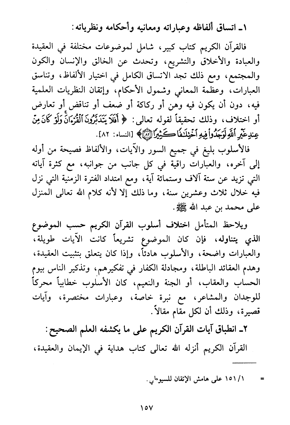 فالقرآن الكريم كتاب كبير، شامل لموضوعات مختلفة في العقيدة والعبادة والأخلاق والتشريع، وتحدث عن الخالق والإنسان والكون والمجتمع، ومع ذلك تجد الاتساق الكامل في اختيار الألفاظ، وتناسق العبارات، وعظمة المعاني وشمول الأحكام، وإتقان النظريات العلمية فيه، دون أن يكون فيه وهن أو ركاكة أو ضعف أو تناقض أو تعارض أو اختلاف، وذلك تحقيقًا لقوله تعالى: {أَفَلَا يَتَدَبَّرُونَ الْقُرْآنَ وَلَوْ كَانَ مِنْ عِنْدِ غَيْرِ اللَّهِ لَوَجَدُوا فِيهِ اخْتِلَافًا كَثِيرًا (٨٢)} [النساء: ٨٢].