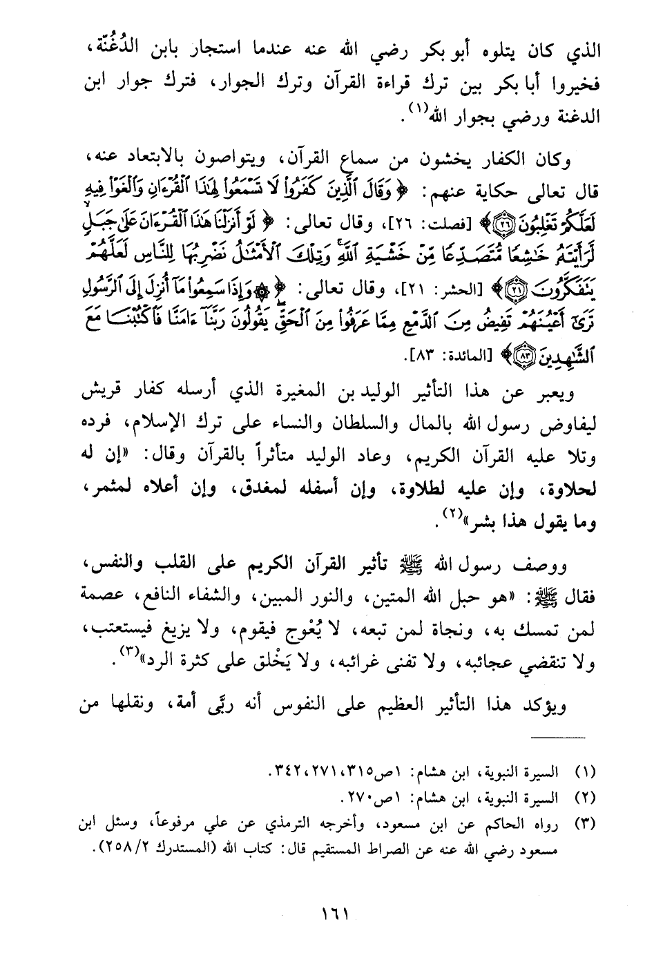 ويعبر عن هذا التأثير الوليد بن المغيرة الذي أرسله كفار قريش ليفاوض رسول الله بالمال والسلطان والنساء على ترك الإِسلام، فرده وتلا عليه القرآن الكريم، وعاد الوليد متأثرًا بالقرآن وقال: "إن له لحلاوة، وإن عليه لطلاوة، وإن أسفله لمغدق، وإن أعلاه لمثمر، وما يقول هذا بشر" (٢).
