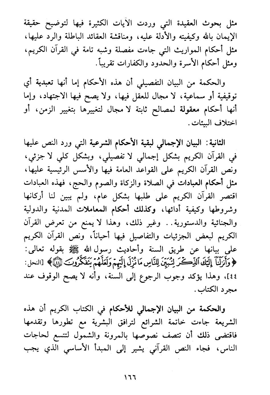 الثانية: البيان الإجمالي لبقية الأحكام الشرعية التي ورد النص عليها في القرآن الكريم بشكل إجمالي لا تفصيلي، وبشكل كلي لا جزئي، ونص القرآن الكريم على القواعد العامة فيها والأسس الرئيسية عليها، مثل أحكام العبادات في الصلاة والزكاة والصوم والحج، فهذه العبادات اقتصر القرآن الكريم على طلبها بشكل عام، ولم يبين لنا أركانها وشروطها وكيفية أدائها، وكذلك أحكام المعاملات المدنية والدولية والجنائية والدستورية .. وغير ذلك، وهذا لا يمنع من تعرض القرآن الكريم لبعض الجزئيات والتفاصيل فيها أحيانًا، ونص القرآن الكريم على بيانها عن طريق السنة وأحاديث رسول الله - صلى الله عليه وسلم - بقوله تعالى: {بِالْبَيِّنَاتِ وَالزُّبُرِ وَأَنْزَلْنَا إِلَيْكَ الذِّكْرَ لِتُبَيِّنَ لِلنَّاسِ مَا نُزِّلَ إِلَيْهِمْ وَلَعَلَّهُمْ يَتَفَكَّرُونَ (٤٤)} [النحل: ٤٤] وهذا يؤكد وجوب الرجوع إلى السنة، وأنه لا يصح الوقوف عند مجرد الكتاب.