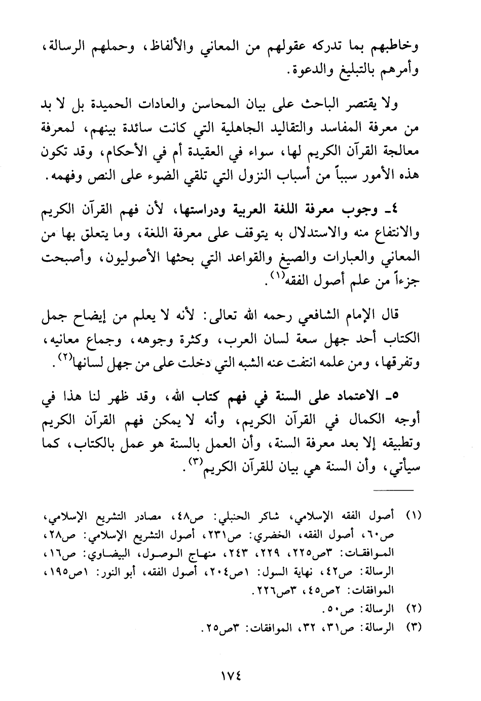 ٤ - وجوب معرفة اللغة العربية ودراستها؛ لأن فهم القرآن الكريم والانتفاع منه والاستدلال به يتوقف على معرفة اللغة، وما يتعلق بها من المعاني والعبارات والصيغ والقواعد التي بحثها الأصوليون، وأصبحت جزءًا من علم أصول الفقه (١).