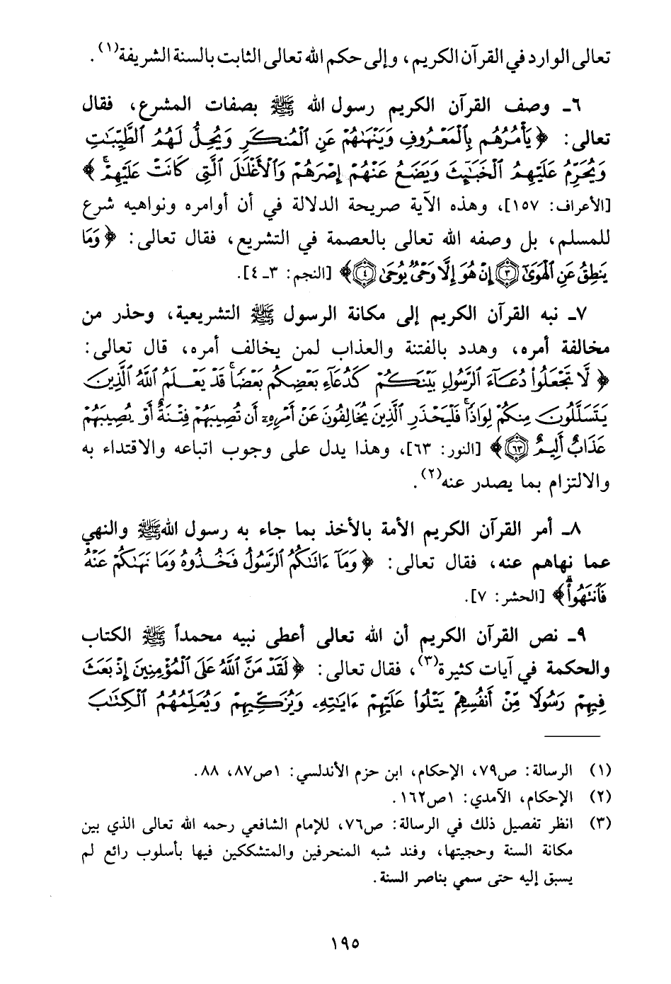 ٦ - وصف القرآن الكريم رسول الله - صلى الله عليه وسلم - بصفات المشرع، فقال تعالى: {يَأْمُرُهُمْ بِالْمَعْرُوفِ وَيَنْهَاهُمْ عَنِ الْمُنْكَرِ وَيُحِلُّ لَهُمُ الطَّيِّبَاتِ وَيُحَرِّمُ عَلَيْهِمُ الْخَبَائِثَ وَيَضَعُ عَنْهُمْ إِصْرَهُمْ وَالْأَغْلَالَ الَّتِي كَانَتْ عَلَيْهِمْ} [الأعراف: ١٥٧]، وهذه الآية صريحة الدلالة في أن أوامره ونواهيه شرع للمسلم، بل وصفه الله تعالى بالعصمة في التشريع، فقال تعالى: {وَمَا يَنْطِقُ عَنِ الْهَوَى (٣) إِنْ هُوَ إلا وَحْيٌ يُوحَى (٤)} [النجم: ٣، ٤].
