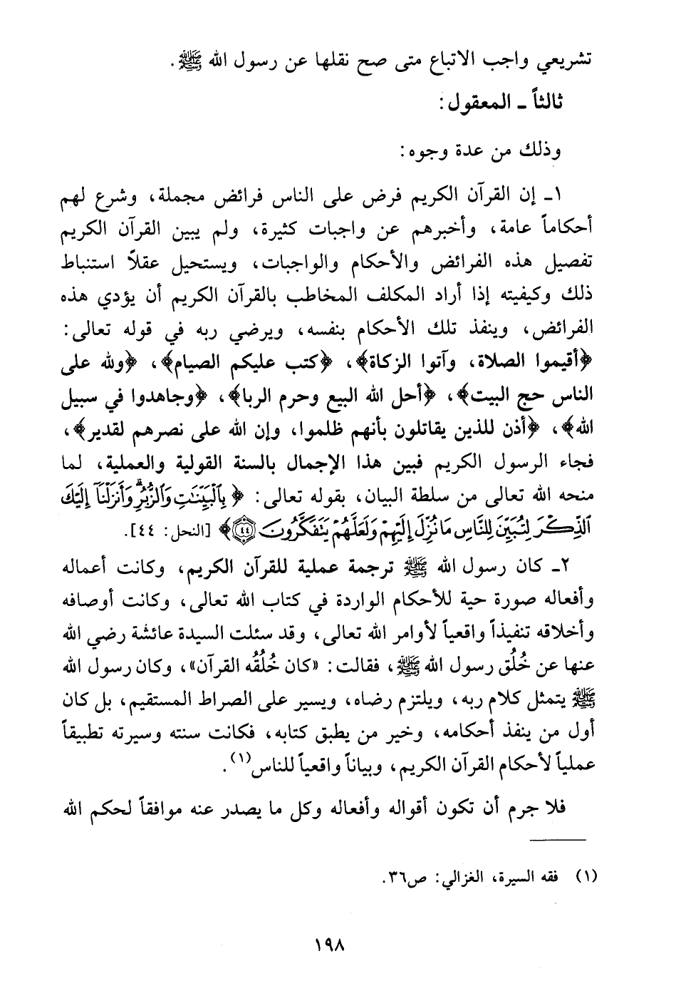 ١ - إن القرآن الكريم فرض على الناس فرائض مجملة، وشرع لهم أحكامًا عامة، وأخبرهم عن واجبات كثيرة، ولم يبين القرآن الكريم تفصيل هذه الفرائض والأحكام والواجبات، ويستحيل عقلًا استنباط ذلك وكيفيته إذا أراد المكلف المخاطب بالقرآن الكريم أن يؤدي هذه الفرائض، وينفذ تلك الأحكام بنفسه، ويرضي ربه في قوله تعالى: {وَأَقِيمُوا الصَّلَاةَ وَآتُوا الزَّكَاةَ}، {كُتِبَ عَلَيْكُمُ الصِّيَامُ}، {وَلِلَّهِ عَلَى النَّاسِ حِجُّ الْبَيْتِ}، {وَأَحَلَّ اللَّهُ الْبَيْعَ وَحَرَّمَ الرِّبَا}، {وَجَاهَدُوا فِي سَبِيلِ اللَّهِ}، {أُذِنَ لِلَّذِينَ يُقَاتَلُونَ بِأَنَّهُمْ ظُلِمُوا وَإِنَّ اللَّهَ عَلَى نَصْرِهِمْ لَقَدِيرٌ}، فجاء الرسول الكريم فبين هذا الإجمال بالسنة القولية والعملية، لما منحه الله تعالى من سلطة البيان، بقوله تعالى: {بِالْبَيِّنَاتِ وَالزُّبُرِ وَأَنْزَلْنَا إِلَيْكَ الذِّكْرَ لِتُبَيِّنَ لِلنَّاسِ مَا نُزِّلَ إِلَيْهِمْ وَلَعَلَّهُمْ يَتَفَكَّرُونَ (٤٤)} [النحل: ٤٤].