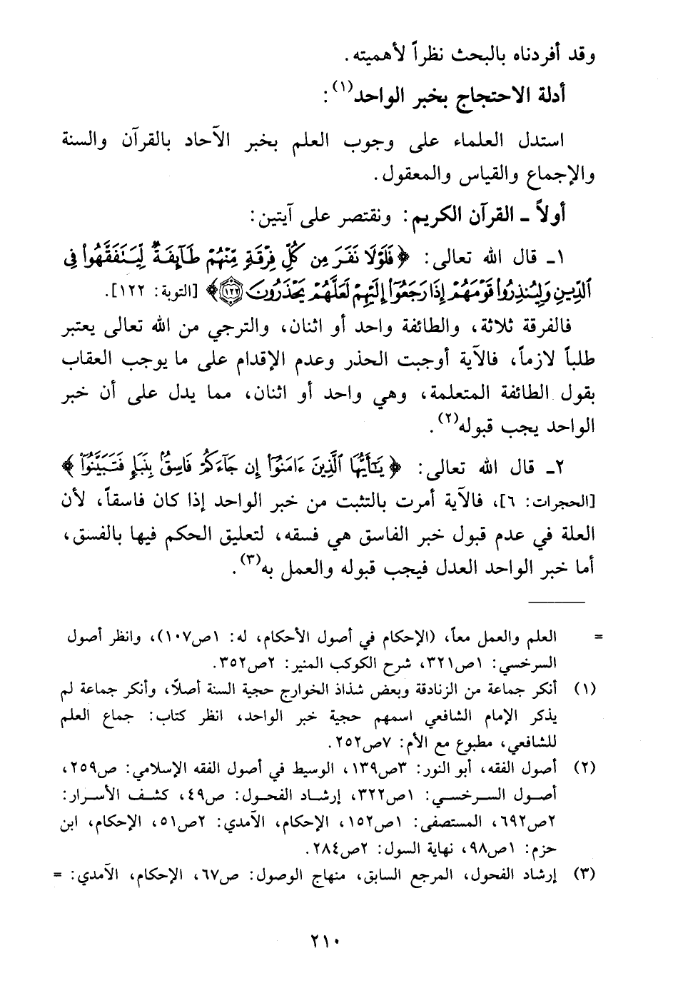 ١ - قال الله تعالى: {فَلَوْلَا نَفَرَ مِنْ كُلِّ فِرْقَةٍ مِنْهُمْ طَائِفَةٌ لِيَتَفَقَّهُوا فِي الدِّينِ وَلِيُنْذِرُوا قَوْمَهُمْ إِذَا رَجَعُوا إِلَيْهِمْ لَعَلَّهُمْ يَحْذَرُونَ (١٢٢)} [التوبة: ١٢٢].