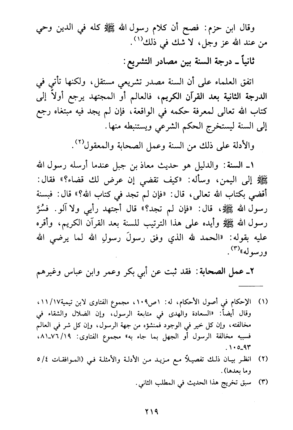 ١ - السنة: والدليل هو حديث معاذ بن جبل عندما أرسله رسول الله - صلى الله عليه وسلم - إلى اليمن، وسأله: "كيف تقضي إن عرض لك قضاء؟ " فقال: أقضي بكتاب الله تعالى، قال: "فإن لم تجد في كتاب الله؟ " قال: فبسنة رسول الله - صلى الله عليه وسلم -، قال: "فإن لم تجد؟ " قال أجتهد رأيي ولا آلو. فسُرَّ رسول الله - صلى الله عليه وسلم - وأيده على هذا الترتيب للسنة بعد القرآن الكريم، وأقره عليه بقوله: "الحمد لله الذي وفق رسولَ رسولِ الله لما يرضي الله ورسوله" (٣).