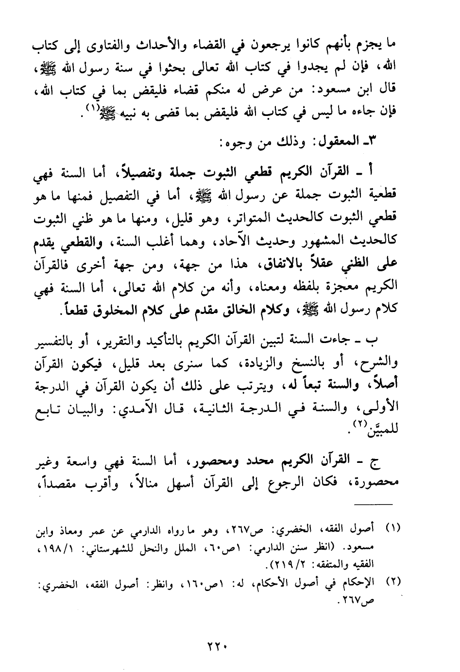 (١) أصول الفقه، الخضري: ص ٢٦٧، وهو ما رواه الدارمي عن عمر ومعاذ وابن مسعود. (انظر سنن الدارمي: ١ ص ٦٠، الملل والنحل للشهرستاني: ١/ ١٩٨، الفقيه والمتفقه: ٢/ ٢١٩).