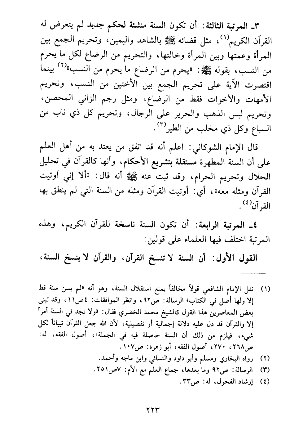 (١) نقل الإمام الشافعي قولًا مخالفًا يمنع استقلال السنة، وهو أنه "لم يسن سنة قط إلا ولها أصل في الكتاب" الرسالة: ص ١٩٢، وانظر الموافقات: ٤ ص ١١، وقد تبنى بعض المعاصرين هذا القول كالشيخ محمَّد الخضري فقال: "ولا تجد في السنة أمرًا إلا والقرآن قد دل عليه دلالة إجمالية أو تفصيلية؛ لأن الله جعل القرآن تبيانًا لكل شيء، فيلزم من ذلك أن السنة حاصلة فيه في الجملة"، أصول الفقه، له: ص ٢٦٨، ٢٧٠، أصول الفقه، أبو زهرة: ص ١٠٧.