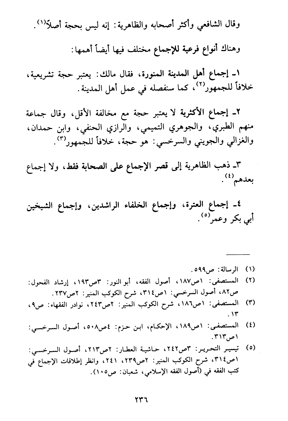 (٥) تيسير التحرير: ٣ ص ٢٤٢، حاشية العطار: ٢ ص ٢١٣، أصول السرخسي: ١ ص ٣١٤، شرح الكوكب المنير: ٢ ص ٢٣٩، ٢٤١، وانظر إطلاقات الإجماع في كتب الفقه في (أصول الفقه الإِسلامي، شعبان: ص ١٠٥).