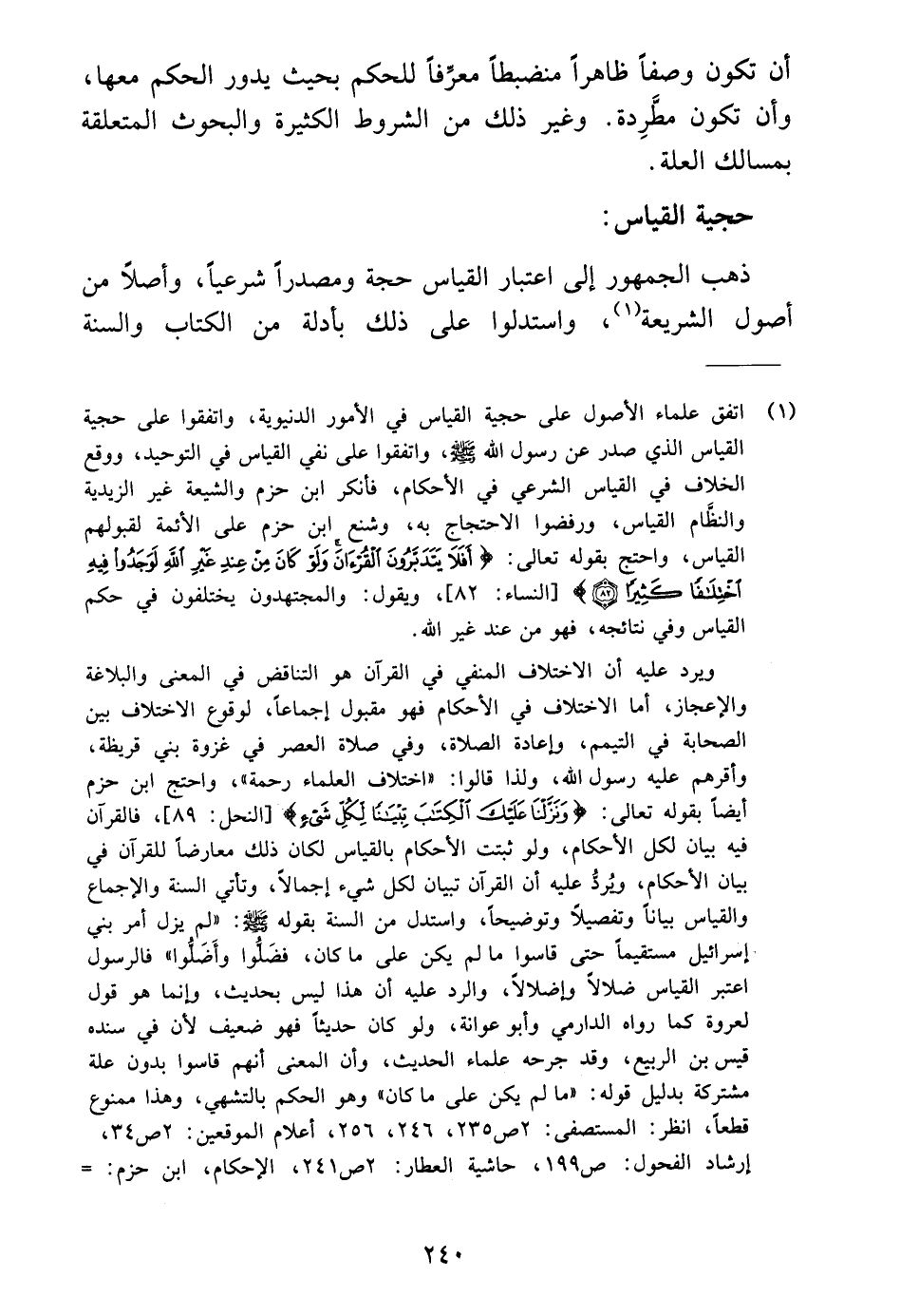 (١) اتفق علماء الأصول على حجية القياس في الأمور الدنيوية، واتفقوا على حجية القياس الذي صدر عن رسول الله - صلى الله عليه وسلم -، واتفقوا على نفي القياس في التوحيد، ووقع الخلاف في القياس الشرعي في الأحكام، فأنكر ابن حزم والشيعة غير الزيدية والنظام القياس، ورفضوا الاحتجاج به، وشنع ابن حزم على الأئمة لقبولهم القياس، واحتج بقوله تعالى: {أَفَلَا يَتَدَبَّرُونَ الْقُرْآنَ وَلَوْ كَانَ مِنْ عِنْدِ غَيْرِ اللَّهِ لَوَجَدُوا فِيهِ اخْتِلَافًا كَثِيرًا (٨٢)} [النساء: ٨٢] ويقول: والمجتهدون يختلفون في حكم القياس وفي نتائجه، فهو من عند غير الله.