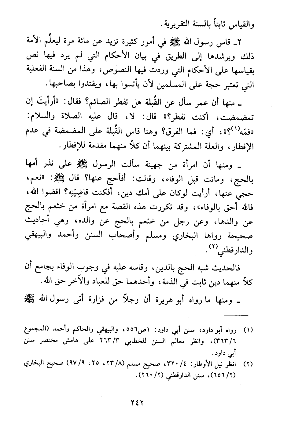 ٢ - قاس رسول الله - صلى الله عليه وسلم - في أمور كثيرة تزيد عن مائة مرة ليعلم الأمة ذلك ويرشدها إلى الطريق في بيان الأحكام التي لم يرد فيها نص بقياسها على الأحكام التي وردت فيها النصوص، وهذا من السنة الفعلية التي تعتبر حجة على المسلمين لأن يأتسوا بها، ويقتدوا بصاحبها.