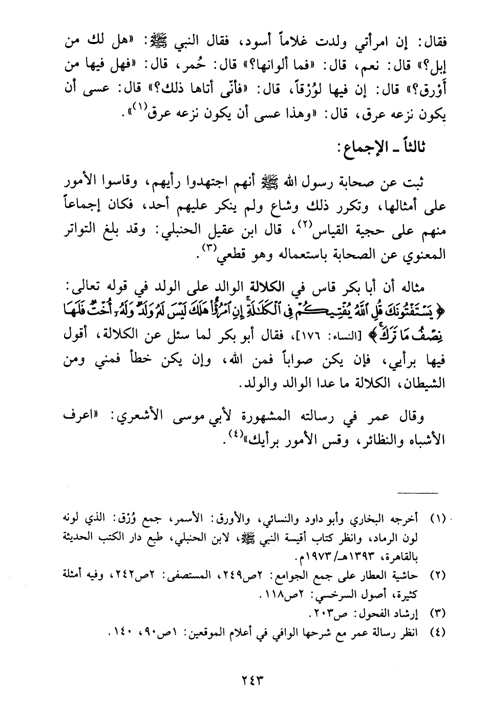(١) أخرجه البخاري وأبو داود والنسائي، والأورق: الأسمر، جمع وُرْق: الذي لونه لون الرماد، وانظر كتاب أقيسة النبي - صلى الله عليه وسلم -، لابن الحنبلي، طبع دار الكتب الحديثة بالقاهرة، ١٣٩٣ هـ/ ١٩٧٣ م.