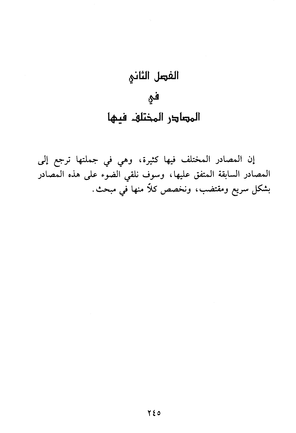 إن المصادر المختلف فيها كثيرة، وهي في جملتها ترجع إلى المصادر السابقة المتفق عليها، وسوف نلقي الضوء على هذه المصادر بشكل سريع ومقتضب، ونخصص كلًّا منها في مبحث.