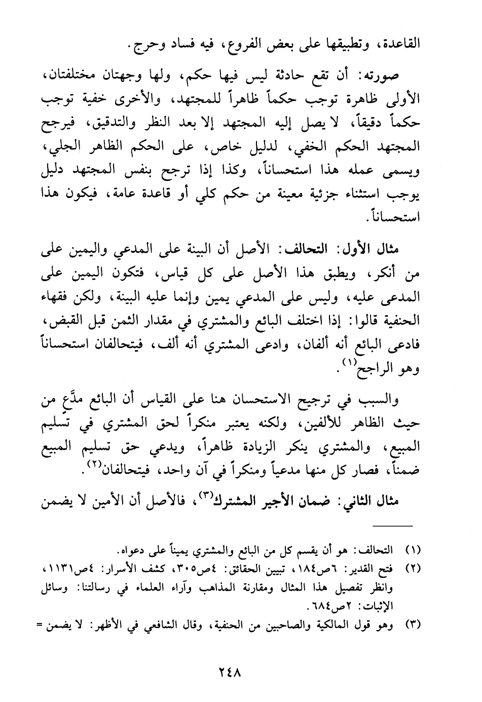 (٢) فتح القدير: ٦ ص ١٨٤، تبيين الحقائق: ٤ ص ٣٠٥، كشف الأسرار: ٤ ص ١١٣١، وانظر تفصيل هذا المثال ومقارنة المذاهب وآراء العلماء في رسالتنا: وسائل الإثبات: ٢ ص ٦٨٤.