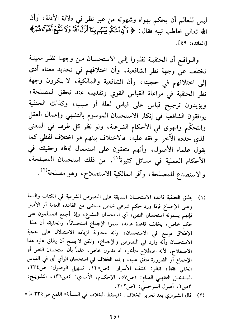 والواقع أن الحنفية نظروا إلى الاستحسان من وجهة نظر معينة تختلف عن وجهة نظر الشافعية، وأن اختلافهم في تحديد معناه أدى إلى اختلافهم في حجيته، وأن الشافعية والمالكية، لا ينكرون وجهة نظر الحنفية في مراعاة القياس القوي وتقديمه عند تحقق المصلحة، ويؤيدون ترجيح قياس على قياس لعلة أو سبب، وكذلك الحنفية يوافقون الشافعية في إنكار الاستحسان الموسوم بالتشهي وإعمال العقل والتحكّم والهوى في الأحكام الشرعية، ولو نظر كل طرف في المعنى الذي حدده الآخر لوافقه عليه، فالاختلاف بينهم هو اختلاف لفظي كما يقول علماء الأصول، وأنهم متفقون على استعمال لفظه وحقيقته في الأحكام العملية في مسائل كثيرة (١)، من ذلك استحسان المصلحة، والاستصناع للمصلحة، وأقر المالكية الاستصلاح، وهو مصلحة (٢).