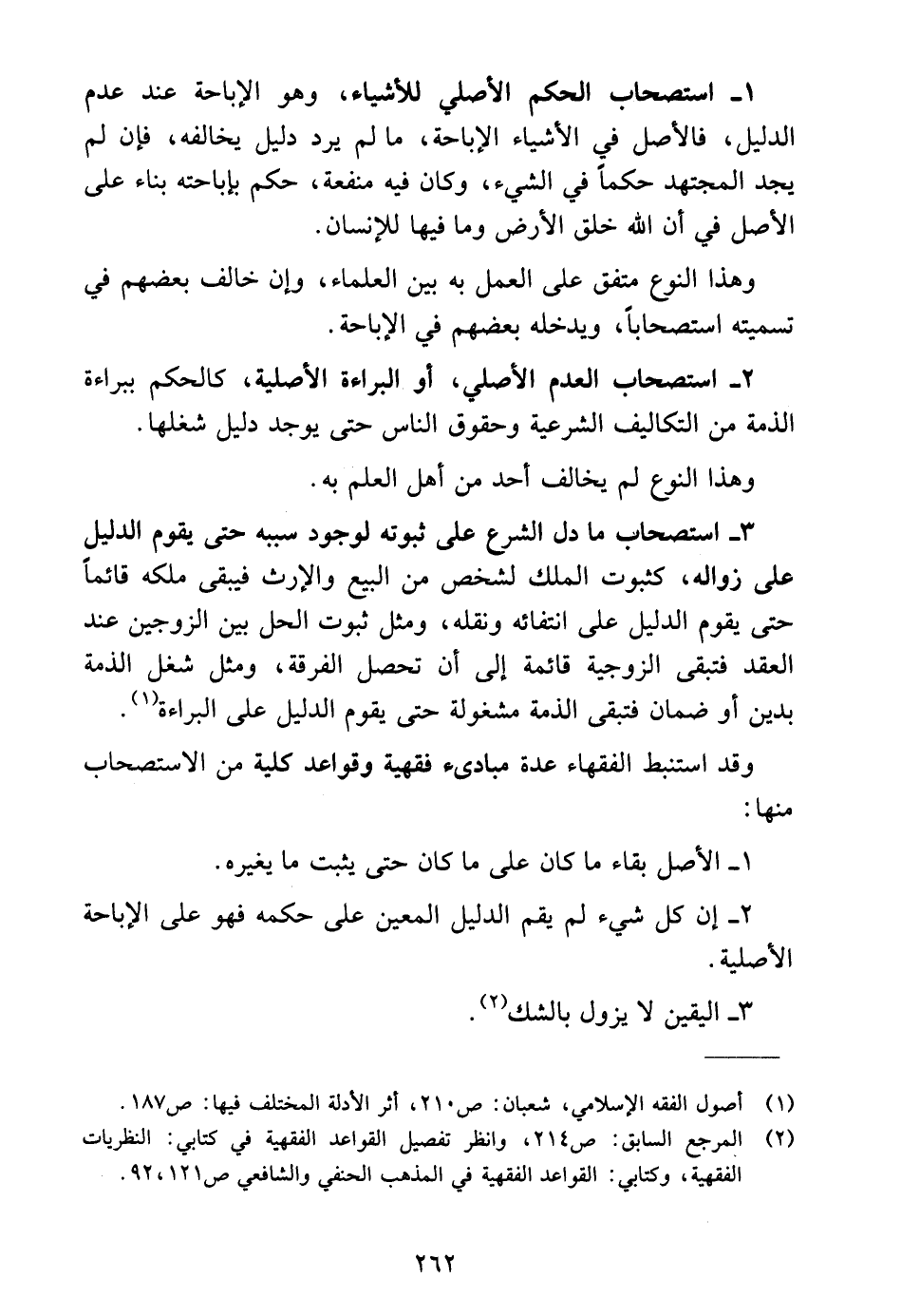 ٣ - استصحاب ما دل الشرع على ثبوته لوجود سببه حتى يقوم الدليل على زواله، كثبوت الملك لشخص من البيع والإرث فيبقى ملكه قائمًا حتى يقوم الدليل على انتفائه ونقله، ومثل ثبوت الحل بين الزوجين عند العقد فتبقى الزوجية قائمة إلى أن تحصل الفرقة، ومثل شغل الذمة بدين أو ضمان فتبقى الذمة مشغولة حتى يقوم الدليل على البراءة (١).