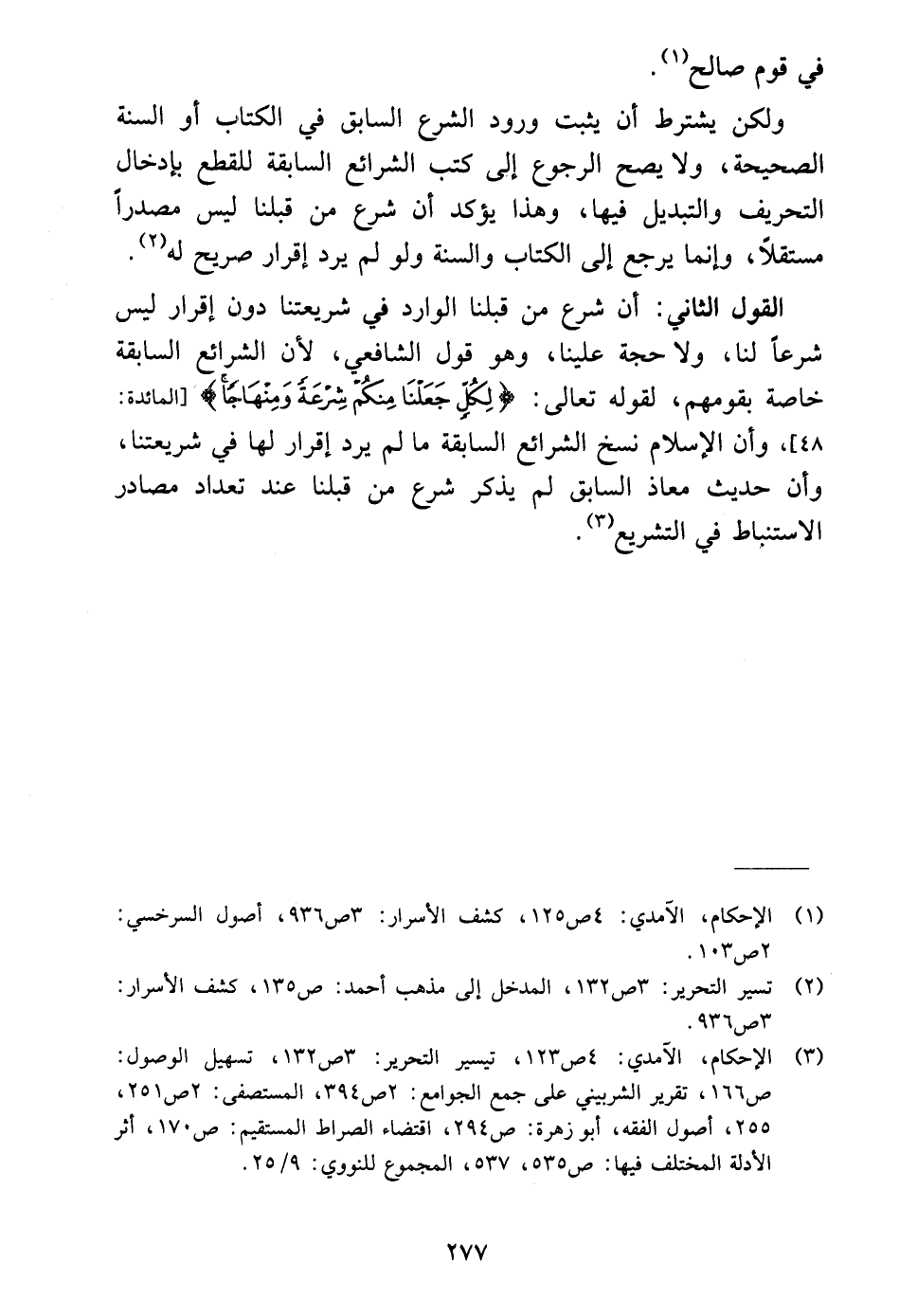القول الثاني: أن شرع من قبلنا الوارد في شريعتنا دون إقرار ليس شرعًا لنا، ولا حجة علينا، وهو قول الشافعي، لأن الشرائع السابقة خاصة بقومهم، لقوله تعالى: {لِكُلٍّ جَعَلْنَا مِنْكُمْ شِرْعَةً وَمِنْهَاجًا} [المائدة: ٤٨]، وأن الإسلام نسخ الشرائع السابقة ما لم يرد إقرار لها في شريعتنا، وأن حديث معاذ السابق لم يذكر شرع من قبلنا عند تعداد مصادر الاستنباط في التشريع (٣).