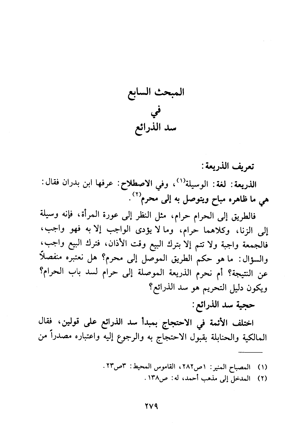 فالطريق إلى الحرام حرام، مثل النظر إلى عورة المرأة، فإنه وسيلة إلى الزنا، وكلاهما حرام، وما لا يؤدى الواجب إلا به فهو واجب، فالجمعة واجبة ولا تتم إلا بترك البيع وقت الأذان، فترك البيع واجب، والسؤال: ما هو حكم الطريق الموصل إلى محرم؟ هل نعتبره منفصلًا عن النتيجة؟ أم نحرم الذريعة الموصلة إلى حرام لسد باب الحرام؟ ويكون دليل التحريم هو سد الذرائع؟