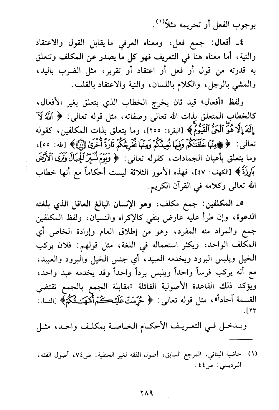٤ - أفعال: جمع فعل، ومعناه العرفي ما يقابل القول والاعتقاد والنية، أما معناه هنا في التعريف فهو كل ما يصدر عن المكلف وتتعلق به قدرته من قول أو فعل أو اعتقاد أو تقرير، مثل الضرب باليد، والمشي بالرجل، والكلام باللسان، والنية والاعتقاد بالقلب.