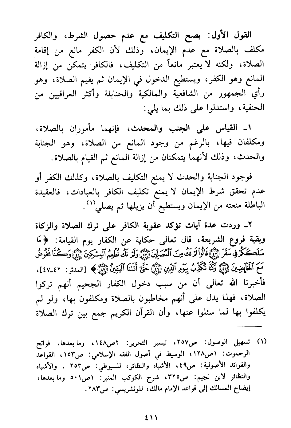 القول الأول: يصح التكليف مع عدم حصول الشرط، والكافر مكلف بالصلاة مع عدم الإيمان، وذلك لأن الكفر مانع من إقامة الصلاة، ولكنه لا يعتبر مانعًا من التكليف، فالكافر يتمكن من إزالة المانع وهو الكفر، ويستطيع الدخول في الإيمان ثم يقيم الصلاة، وهو رأي الجمهور من الشافعية والمالكية والحنابلة وأكثر العراقيين من الحنفية، واستدلوا على ذلك بما يلي: