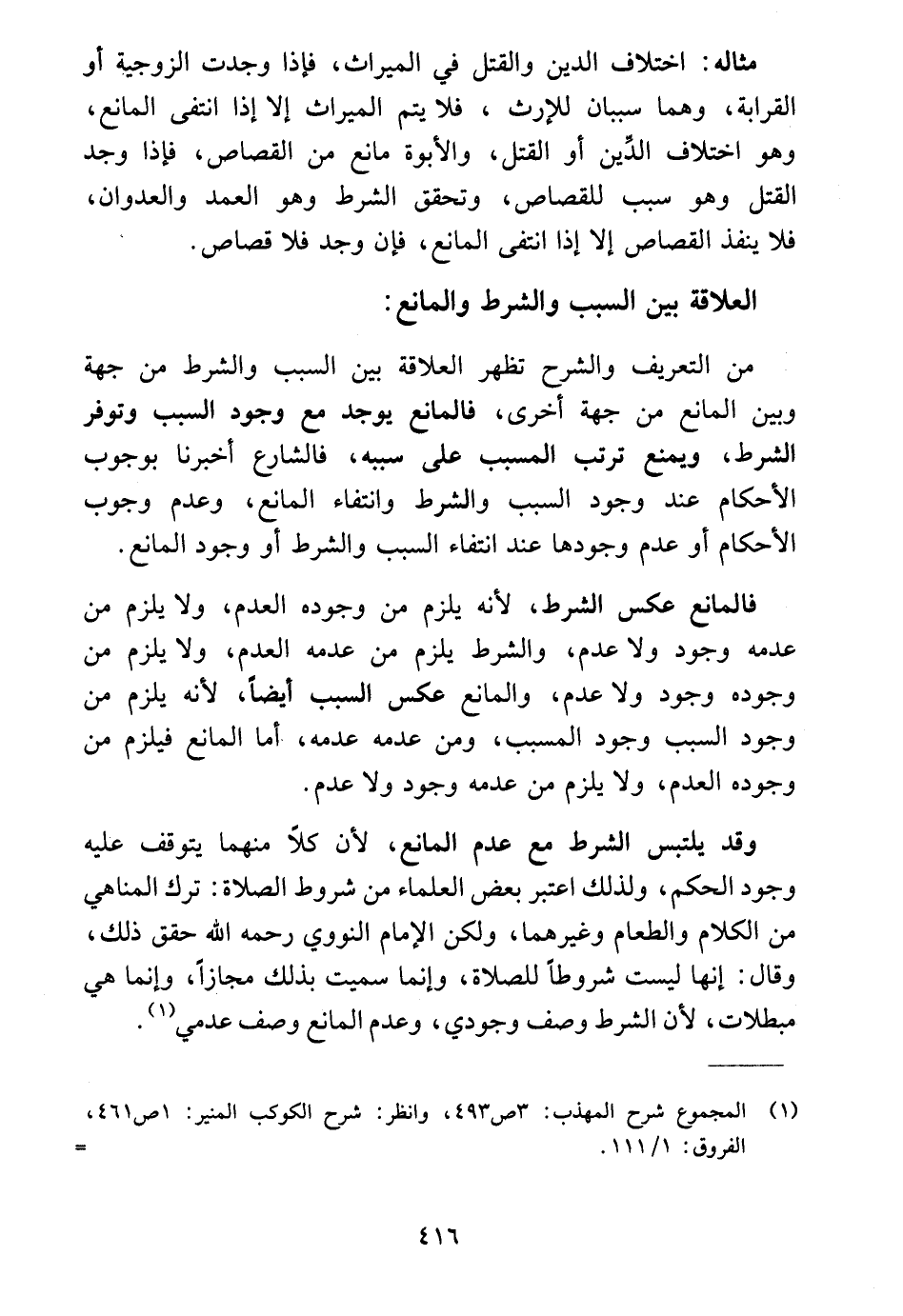 وقد يلتبس الشرط مع عدم المانع، لأن كلًّا منهما يتوقف عليه وجود الحكم، ولذلك اعتبر بعض العلماء من شروط الصلاة: ترك المناهي من الكلام والطعام وغيرهما، ولكن الإمام النووي رحمه اللَّه حقق ذلك، وقال: إنها ليست شروطًا للصلاة، وإنما سميت بذلك مجازًا، وإنما هي مبطلات، لأن الشرط وصف وجودي، وعدم المانع وصف عدمي (١).