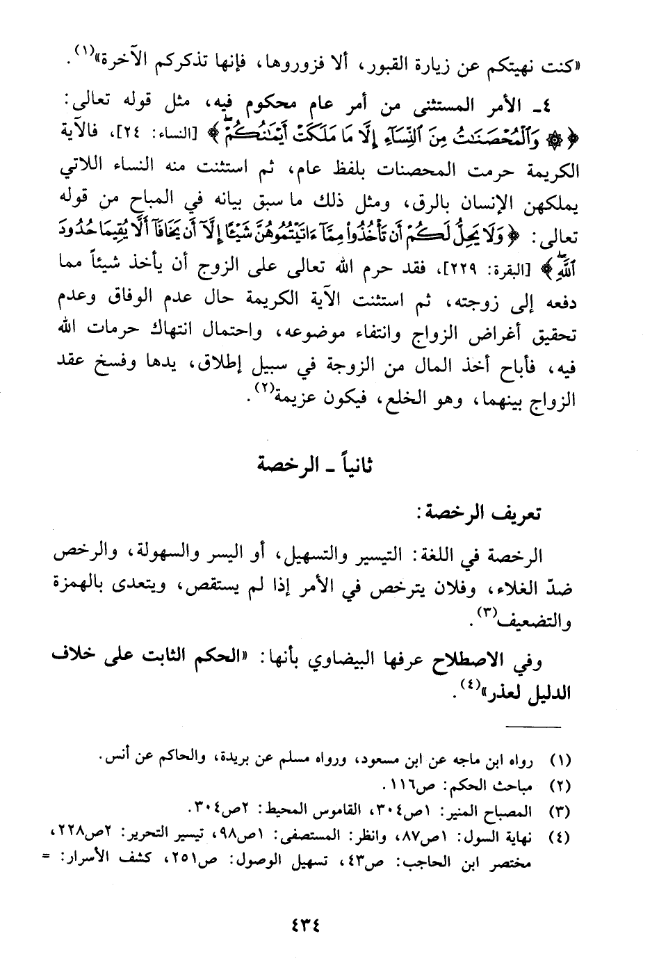 ٤ - الأمر المستثنى من أمر عام محكوم فيه، مثل قوله تعالى: {وَالْمُحْصَنَاتُ مِنَ النِّسَاءِ إلا مَا مَلَكَتْ أَيْمَانُكُمْ} [النساء: ٢٤]، فالآية الكريمة حرمت المحصنات بلفظ عام، ثم استثنت منه النساء اللاتي يملكهن الإنسان بالرق، ومثل ذلك ما سبق بيانه في المباح من قوله تعالى: {وَلَا يَحِلُّ لَكُمْ أَنْ تَأْخُذُوا مِمَّا آتَيْتُمُوهُنَّ شَيْئًا إلا أَنْ يَخَافَا أَلَّا يُقِيمَا حُدُودَ اللَّهِ}] البقرة: ٢٢٩]، فقد حرم اللَّه تعالى على الزوج أن يأخذ شيئًا مما دفعه إلى زوجته، ثم استثنت الآية الكريمة حال عدم الوفاق وعدم تحقيق أغراض الزواج وانتفاء موضوعه، واحتمال انتهاك حرمات اللَّه فيه، فأباح أخذ المال من الزوجة في سبيل إطلاق، يدها وفسخ عقد الزواج بينهما، وهو الخلع، فيكون عزيمة (٢).