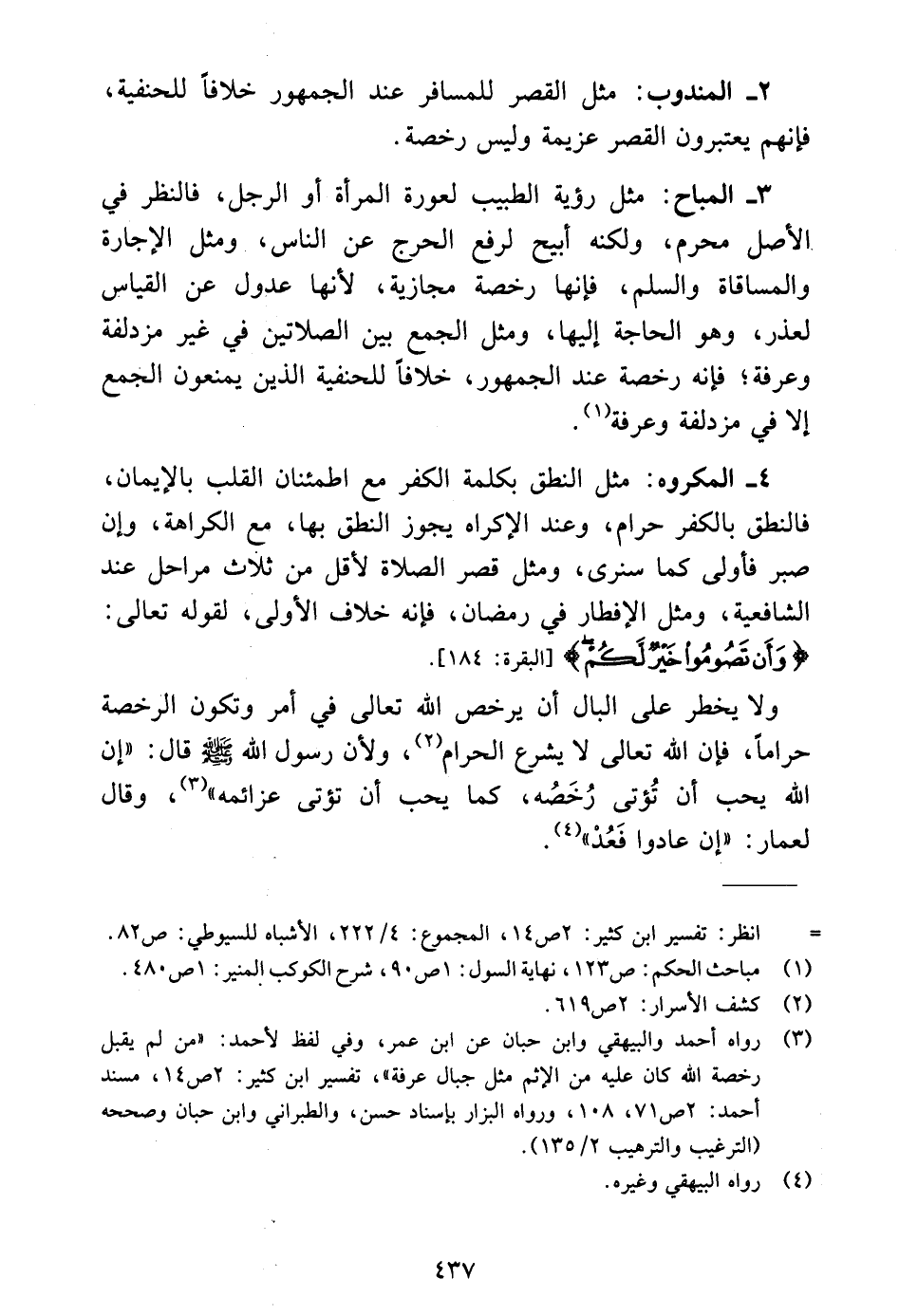 ٤ - المكروه: مثل النطق بكلمة الكفر مع اطمئنان القلب بالإيمان، فالنطق بالكفر حرام، وعند الإكراه يجوز النطق بها، مع الكراهة، وإن صبر فأولى كما سنرى، ومثل قصر الصلاة لأقل من ثلاث مراحل عند الشافعية، ومثل الإفطار في رمضان، فإنه خلاف الأولى، لقوله تعالى: {وَأَنْ تَصُومُوا خَيْرٌ لَكُمْ} [البقرة: ١٨٤].