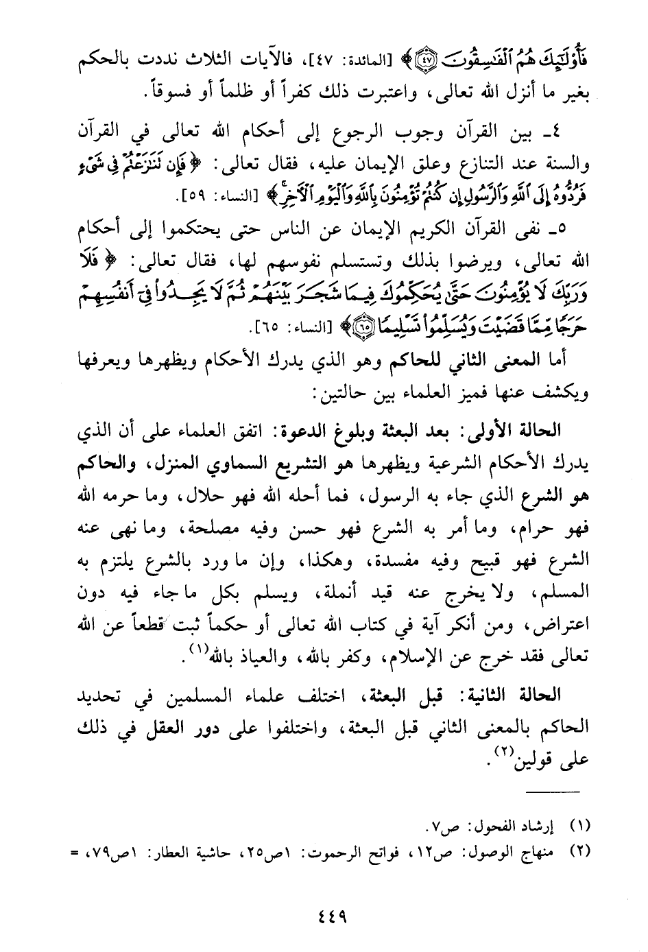 الحالة الأولى: بعد البعثة وبلوغ الدعوة: اتفق العلماء على أن الذي يدرك الأحكام الشرعية ويظهرها هو التشريع السماوي المنزل، والحاكم هو الشرع الذي جاء به الرسول، فما أحله اللَّه فهو حلال، وما حرمه اللَّه فهو حرام، وما أمر به الشرع فهو حسن وفيه مصلحة، وما نهى عنه الشرع فهو قبيح وفيه مفسدة، وهكذا، وإن ما ورد بالشرع يلتزم به المسلم، ولا يخرج عنه قيد أنملة، ويسلم بكل ما جاء فيه دون اعتراض، ومن أنكر آية في كتاب اللَّه تعالى أو حكمًا ثبت قطعًا عن اللَّه تعالى فقد خرج عن الإسلام، وكفر باللَّه، والعياذ باللَّه (١).