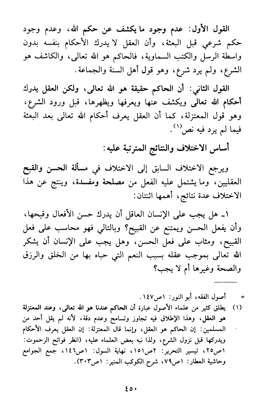 (١) يطلق كثير من علماء الأصول عبارة أن الحاكم عندنا هو اللَّه تعالى، وعند المعتزلة هو العقل، وهذا الإطلاق فيه تجاوز وتسامح وعدم دقة، لأنه لم يقل أحد من المسلمين: إن الحاكم هو العقل، وإنما قال المعتزلة: إن العقل يعرف الأحكام ويدركها قبل نزول الشرع، ولذا نبه بعض العلماء عليه، (انظر فواتح الرحموت: ١ ص ٢٥، تيسير التحرير: ٢ ص ١٥١، نهاية السول: ١ ص ١٤٦، جمع الجوامع وحاشية العطار: ١ ص ٧٩، شرح الكوكب المنير: ١ ص ٣٠٣).