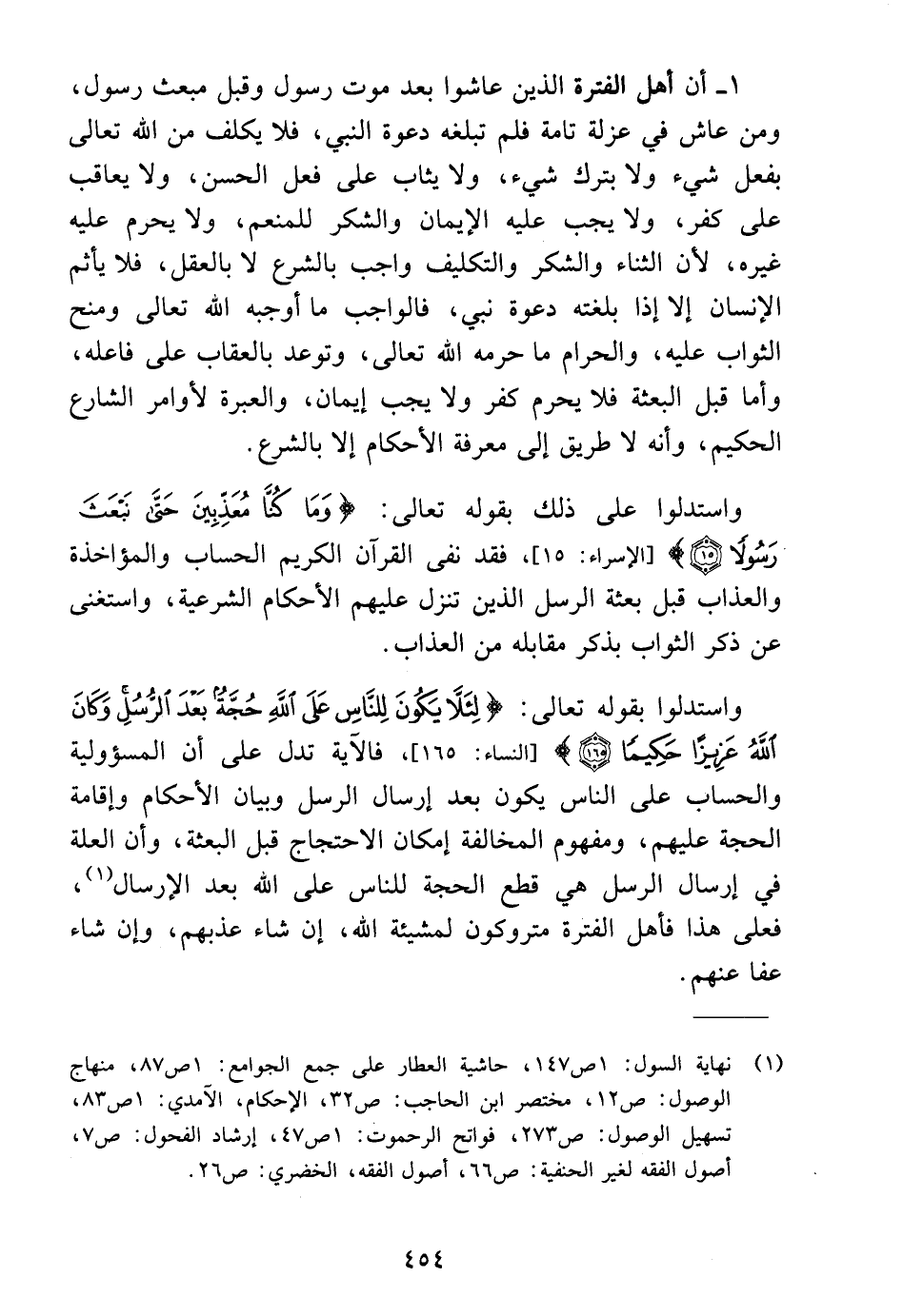 ١ - أن أهل الفترة الذين عاشوا بعد موت رسول وقبل مبعث رسول، ومن عاش في عزلة تامة فلم تبلغه دعوة النبي، فلا يكلف من اللَّه تعالى بفعل شيء ولا بترك شيء، ولا يثاب على فعل الحسن، ولا يعاقب على كفر، ولا يجب عليه الإيمان والشكر للمنعم، ولا يحرم عليه غيره، لأن الثناء والشكر والتكليف واجب بالشرع لا بالعقل، فلا يأثم الإنسان إلا إذا بلغته دعوة نبي، فالواجب ما أوجبه اللَّه تعالى ومنح الثواب عليه، والحرام ما حرمه اللَّه تعالى، وتوعد بالعقاب على فاعله، وأما قبل البعثة فلا يحرم كفر ولا يجب إيمان، والعبرة لأوامر الشارع الحكيم، وأنه لا طريق إلى معرفة الأحكام إلا بالشرع.