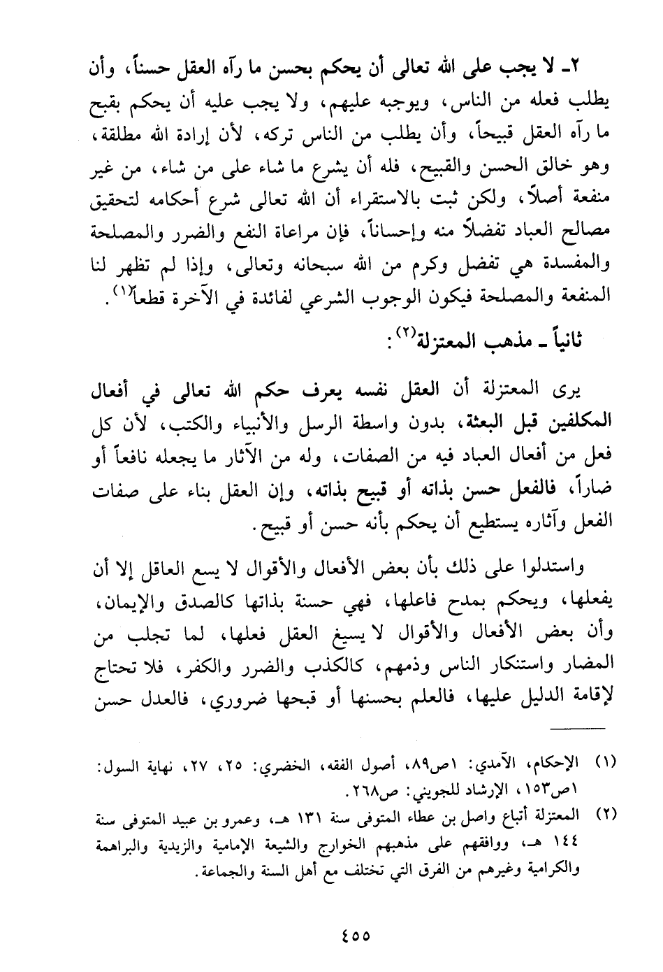 (٢) المعتزلة أتباع واصل بن عطاء المتوفى سنة ١٣١ هـ، وعمرو بن عبيد المتوفى سنة ١٤٤ هـ، ووافقهم على مذهبهم الخوارج والشيعة الإمامية والزيدية والبراهمة والكرامية وغيرهم من الفرق التي تختلف مع أهل السنة والجماعة.