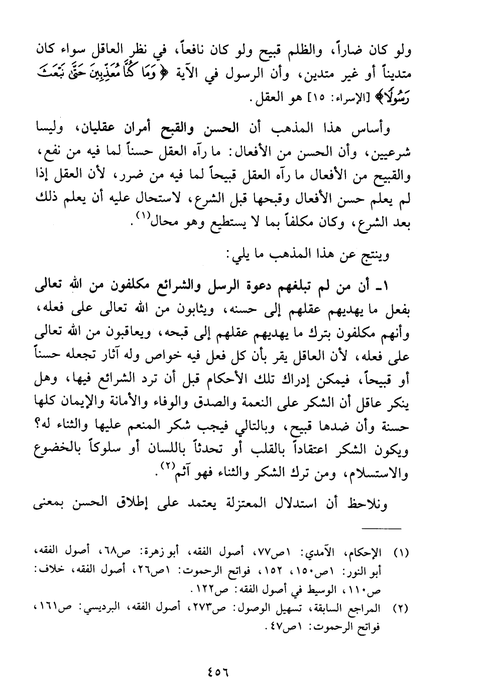 ولو كان ضارًّا، والظلم قبيح ولو كان نافعًا، في نظر العاقل سواء كان متدينًا أو غير متدين، وأن الرسول في الآية {وَمَا كُنَّا مُعَذِّبِينَ حَتَّى نَبْعَثَ رَسُولًا} [الإسراء: ١٥] هو العقل.