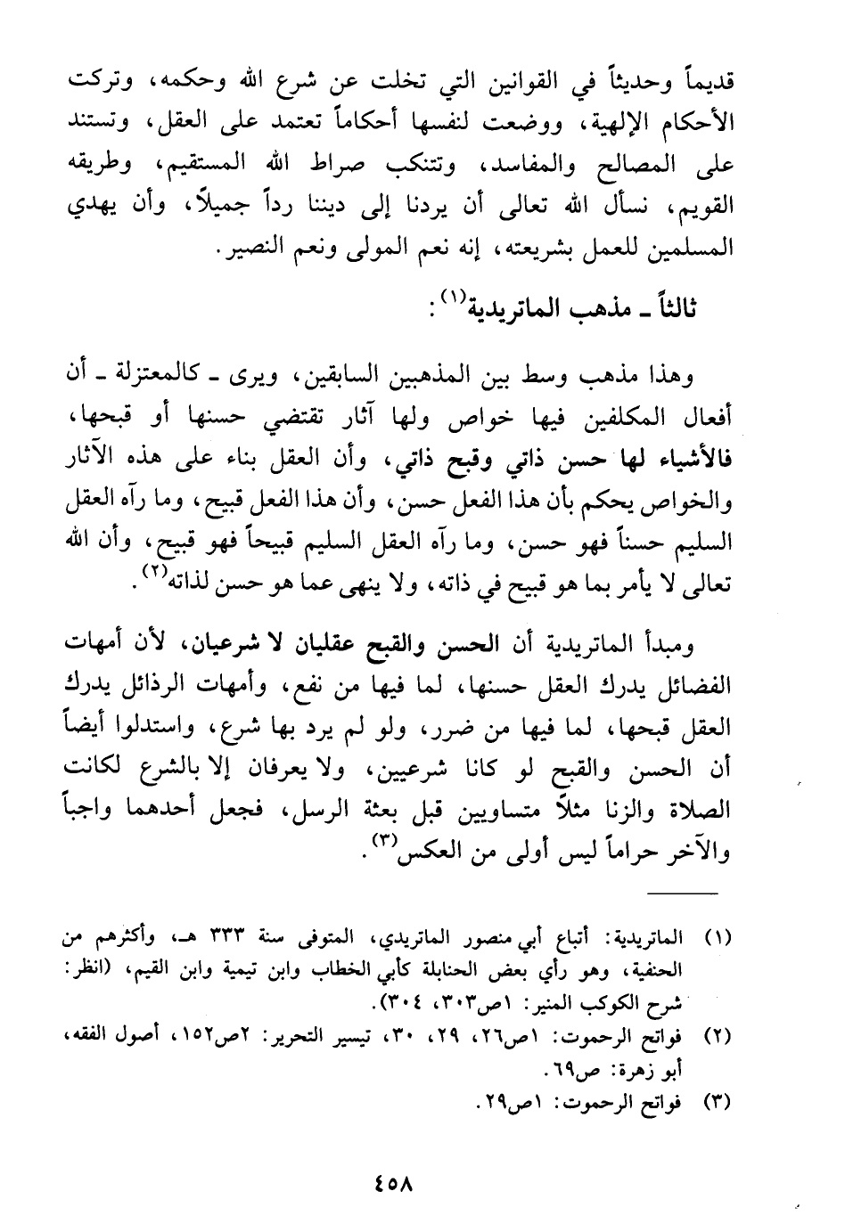 (١) الماتريدية: أتباع أبي منصور الماتريدي، المتوفى سنة ٣٣٣ هـ، وأكثرهم من الحنفية، وهو رأي بعض الحنابلة كأبي الخطاب وابن تيمية وابن القيم، (انظر: شرح الكوكب المنير: ١ ص ٣٠٣، ٣٠٤).