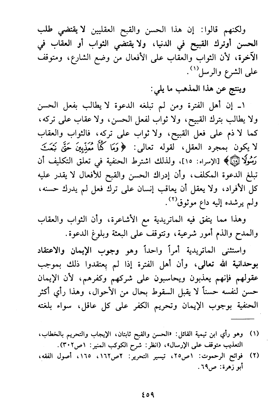 (١) وهو رأي ابن تيمية القائل: "الحسن القبح ثابتان، الإيجاب والتحريم بالخطاب، التعذيب متوقف على الإرسال"، (انظر: شرح الكوكب المنير: ١ ص ٣٠٢).