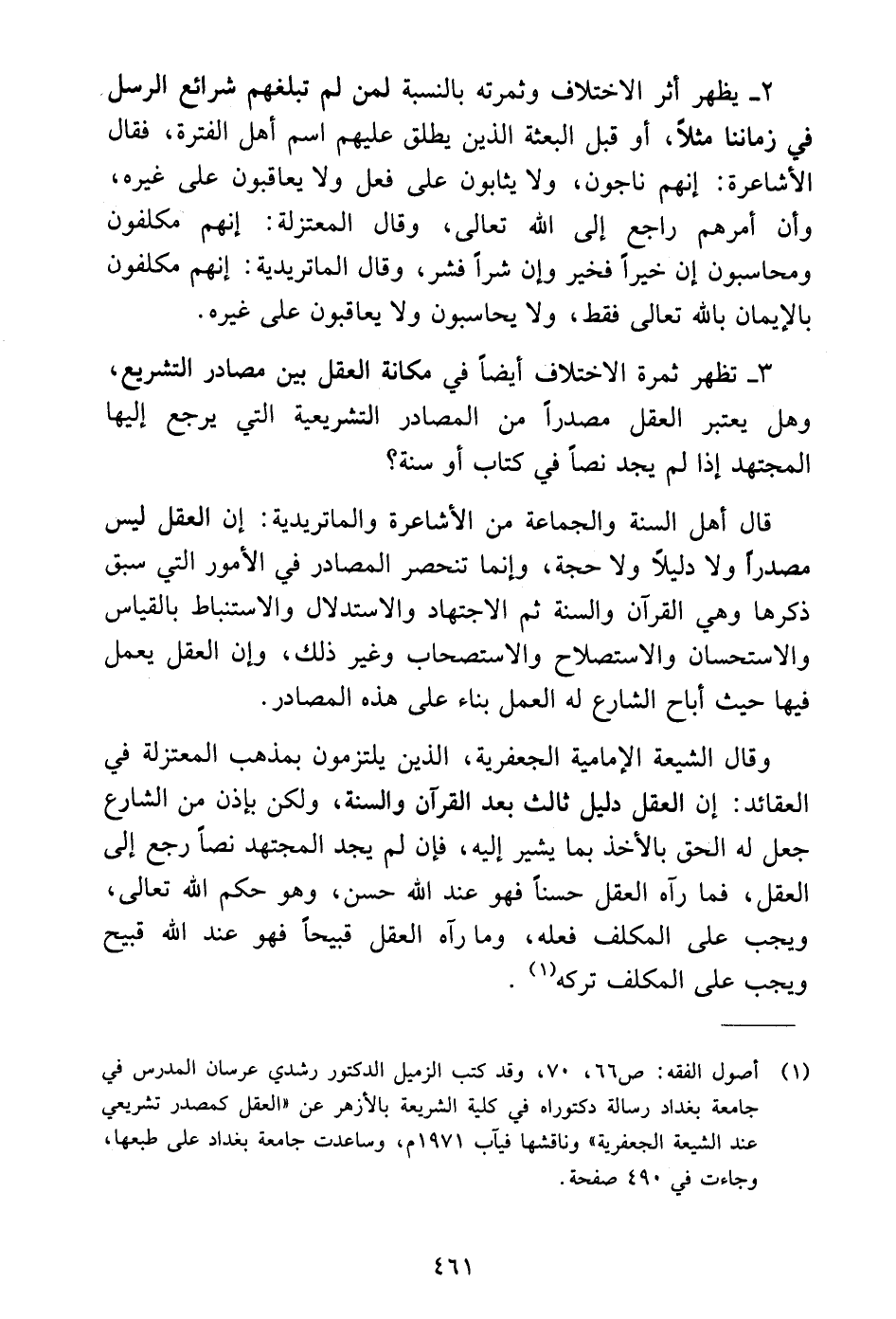 (١) أصول الفقه: ص ٦٦، ٧٠، وقد كتب الزميل الدكتور رشدي عرسان المدرس في جامعة بغداد رسالة دكتوراة في كلية الشريعة بالأزهر عن "العقل كمصدر تشريعي عند الشيعة الجعفرية" وناقشها فيآب ١٩٧١ م، وساعدت جامعة بغداد على طبعها، وجاءت في ٤٩٠ صفحة.