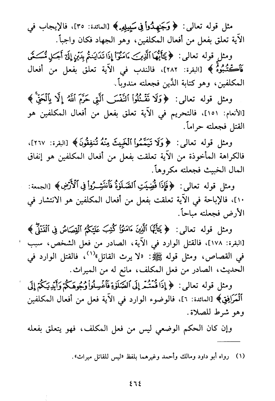 ومثل قوله تعالى: {يَا أَيُّهَا الَّذِينَ آمَنُوا كُتِبَ عَلَيْكُمُ الْقِصَاصُ فِي الْقَتْلَى} [البقرة: ١٧٨]، فالقتل الوارد في الآية، الصادر من فعل الشخص، سبب في القصاص، ومثل قوله - صلى الله عليه وسلم -: "لا يرث القاتل" (١)، فالقتل الوارد في الحديث، الصادر من فعل المكلف، مانع له من الميراث.