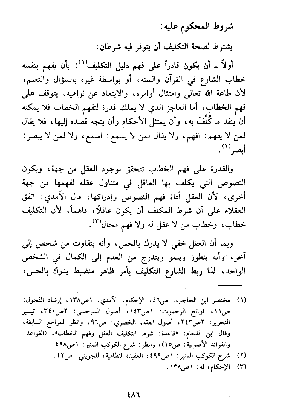 (١) مختصر ابن الحاجب: ص ٤٦، الإحكام، الآمدي: ١ ص ١٣٨، إرشاد الفحول: ص ١١، فواتح الرحموت: ١ ص ١٤٣، أصول السرخسي: ٢ ص ٣٤٠، تيسير التحرير: ٢ ص ٢٤٣، أصول الفقه، الخضري: ص ٩٦، وانظر المراجع السابقة، وقال ابن اللحام: "قاعدة: شرط التكليف العقل وفهم الخطاب"، (القواعد والفوائد الأصولية: ص ١٥)، وانظر: شرح الكوكب المنير: ١ ص ٤٩٨.