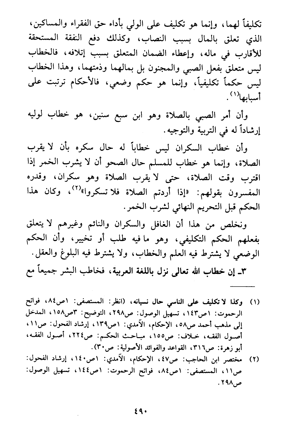 تكليفًا لهما، وإنما هو تكليف على الولي بأداء حق الفقراء والمساكين، الذي تعلق بالمال بسبب النصاب، وكذلك دفع النفقة المستحقة للأقارب في ماله، وإعطاء الضمان المتعلق بسبب إتلافه، فالخطاب ليس متعلق بفعل الصبي والمجنون بل بمالهما وذمتهما، وهذا الخطاب ليس حكمًا تكليفيًّا، وإنما هو حكم وضعي، فالأحكام ترتبت على أسبابها (١).