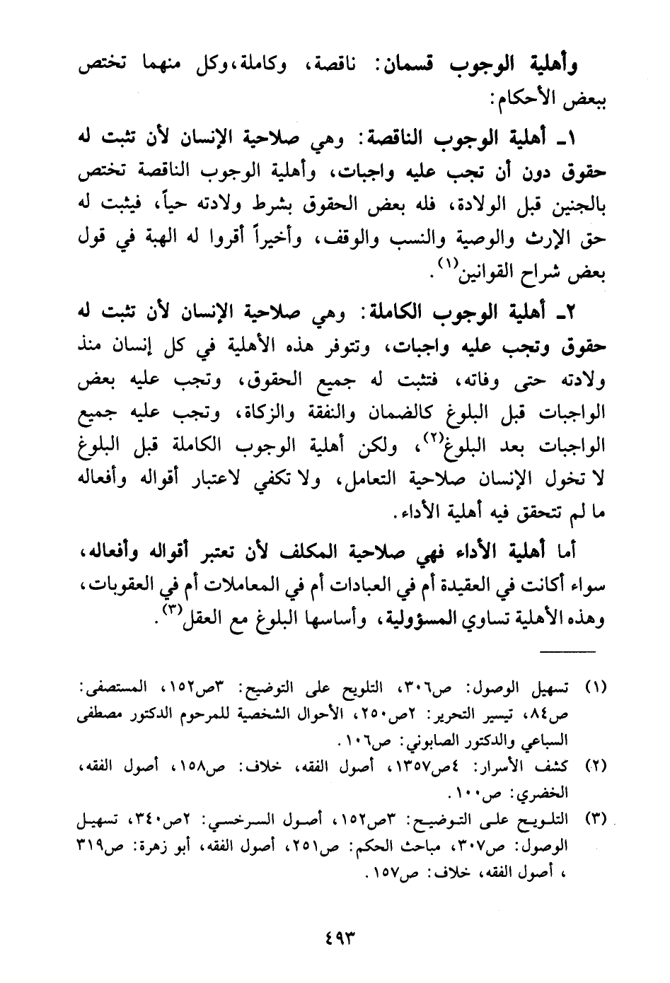 وأهلية الوجوب قسمان: ناقصة، وكاملة، وكل منهما تختص ببعض الأحكام: