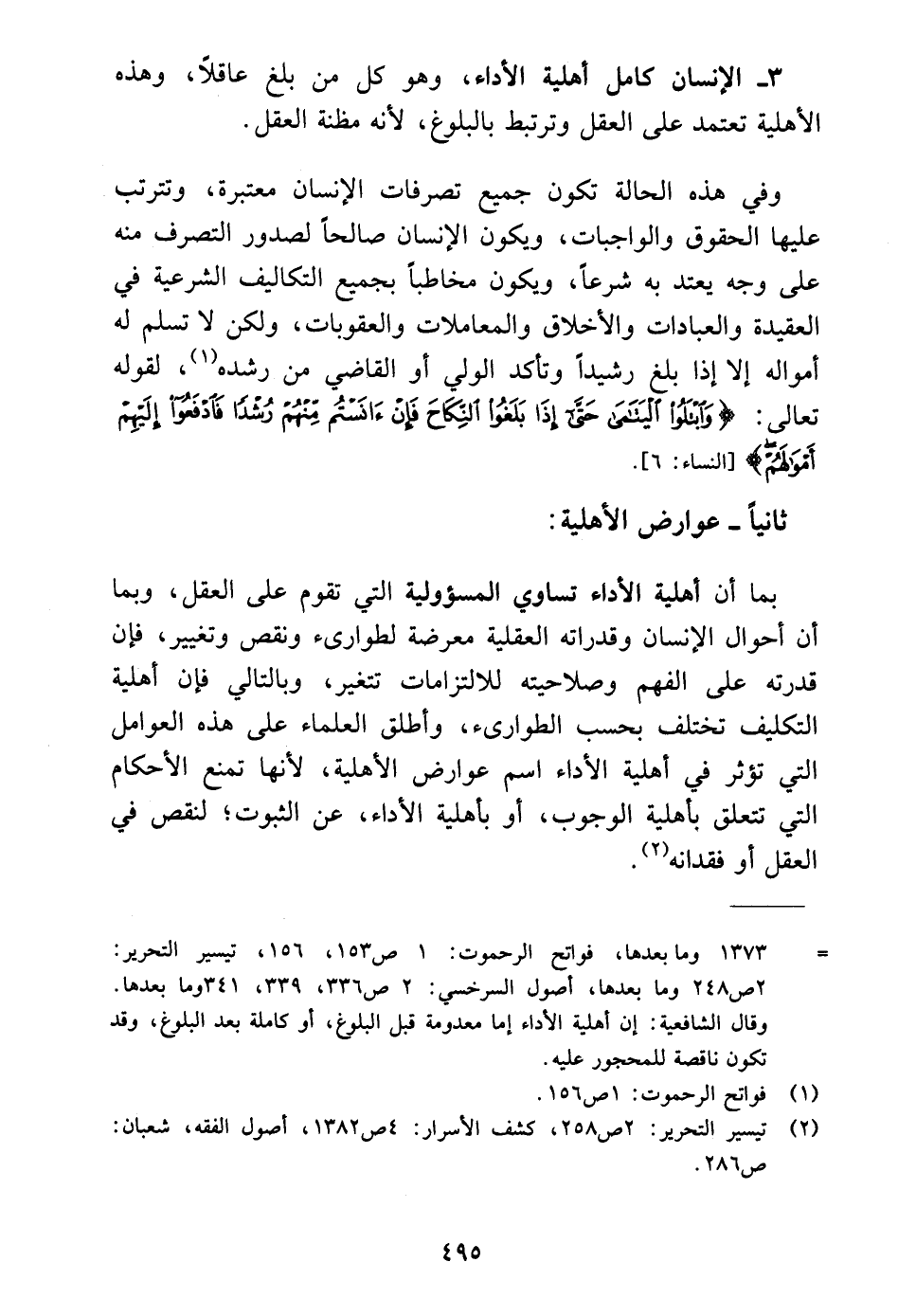 ٣ - الإنسان كامل أهلية الأداء، وهو كل من بلغ عاقلًا، وهذه الأهلية تعتمد على العقل وترتبط بالبلوغ، لأنه مظنة العقل.