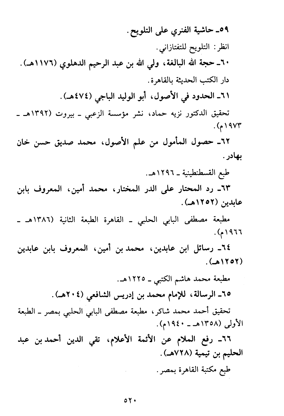 ٦٠ - حجة اللَّه البالغة، ولي اللَّه بن عبد الرحيم الدهلوي (١١٧٦ هـ).