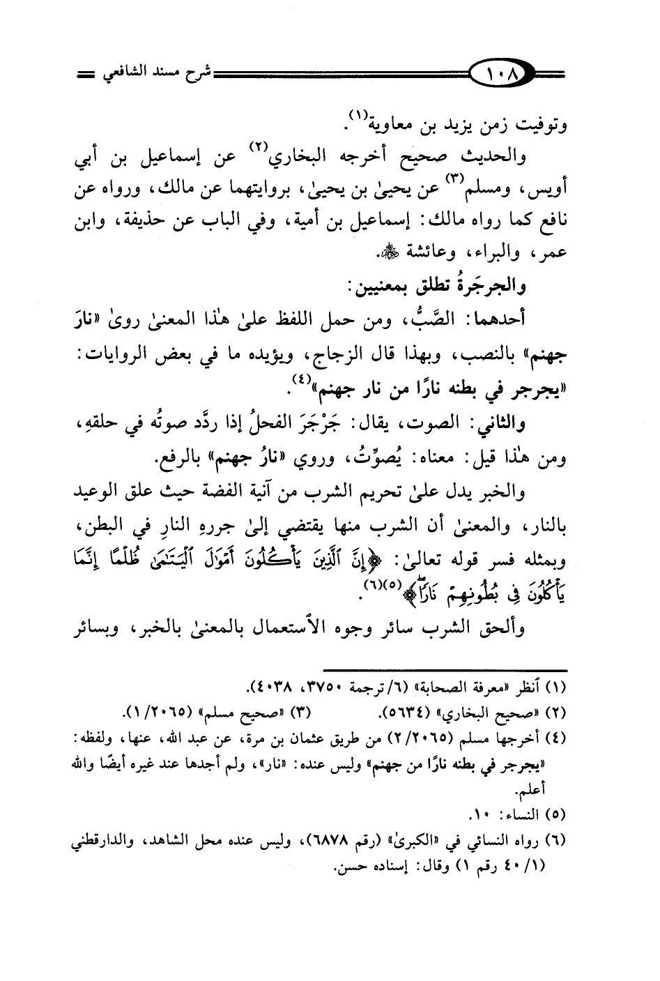 (¬4) أخرجها مسلم (2065/ 2) من طريق عثمان بن مرة، عن عبد الله، عنها, ولفظه: "يجرجر في بطنه نارًا من جهنم" وليس عنده: "نار"، ولم أجدها عند غيره أيضًا والله أعلم.