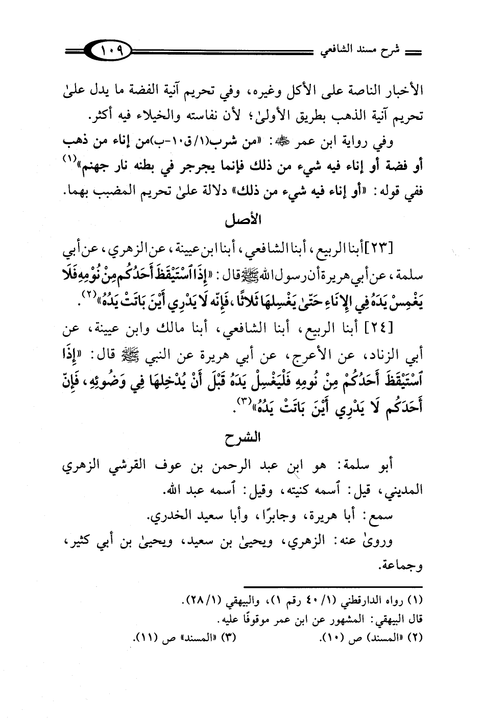 [23] أبنا الربيع، أبنا الشافعي، أبنا ابن عيينة، عن الزهري، عن أبي سلمة، عن أبي هريرة أن رسول الله - صلى الله عليه وسلم - قال: "إِذَا اسْتَيْقَظَ أَحَدُكُم مِنْ نُوْمِهِ فَلَا يَغْمِسْ يَدَهُ في الإِنَاءِ حَتّى يَغْسِلهَا ثَلاثًا، فَإِنّه لاَ يَدْرِي أَيْنَ بَاتَتْ يَدُهُ" (¬2).