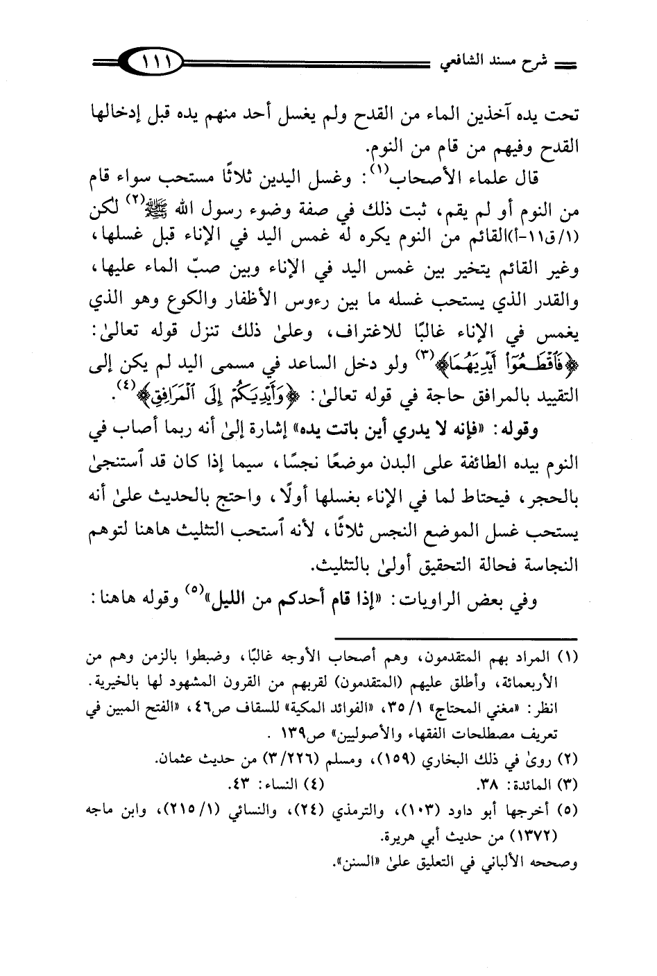 قال علماء الأصحاب (¬1): وغسل اليدين ثلاثًا مستحب سواء قام من النوم أو لم يقم، ثبت ذلك في صفة وضوء رسول الله - صلى الله عليه وسلم - (¬2) لكن (1/ ق 11 - أ) القائم من النوم يكره له غمس اليد في الإناء قبل غسلها، وغير القائم يتخير بين غمس اليد في الإناء وبين صبّ الماء عليها، والقدر الذي يستحب غسله ما بين رءوس الأظفار والكوع وهو الذي يغمس في الإناء غالبًا للاغتراف، وعلى ذلك تنزل قوله تعالى: {فَاقْطَعُوا أَيْدِيَهُمَا} (¬3) ولو دخل الساعد في مسمى اليد لم يكن إلى التقييد بالمرافق حاجة في قوله تعالى: {وَأَيْدِيَكُمْ إِلَى الْمَرَافِقِ} (¬4).