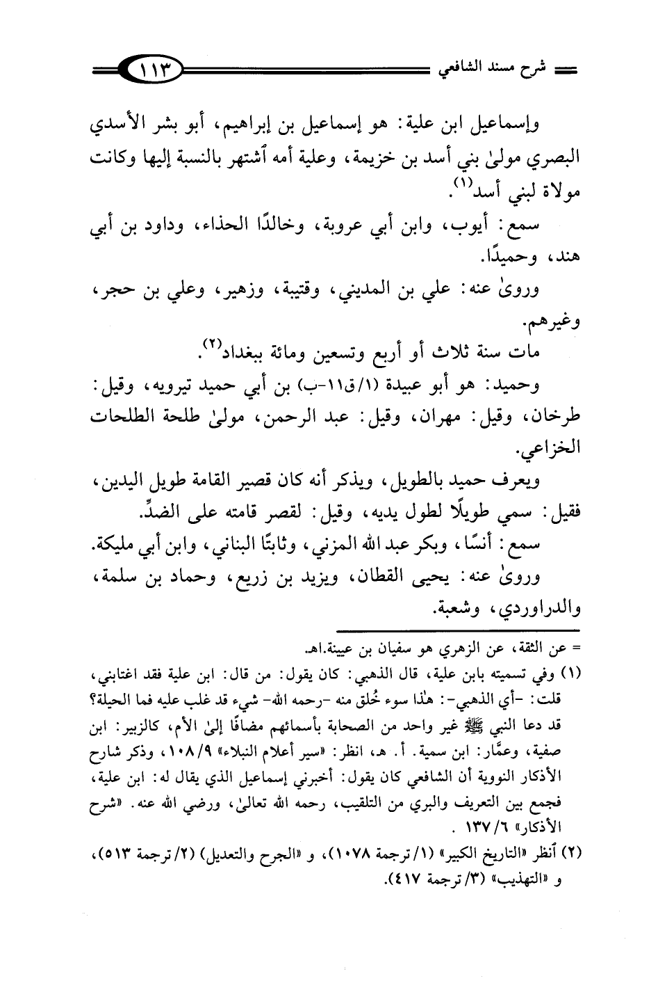 (¬1) وفي تسميته بابن علية، قال الذهبي: كان يقول: من قال: ابن علية فقد اغتابني، قلت: -أي الذهبي-: هذا سوء خُلق منه - رحمه الله - شيء قد غلب عليه فما الحيلة؟ قد دعا النبي - صلى الله عليه وسلم - غير واحد من الصحابة بأسمائهم مضافًا إلى الأم، كالزبير: ابن صفية، وعمَّار: ابن سمية. أ. هـ، انظر: "سير أعلام النبلاء" 9/ 108، وذكر شارح الأذكار النووية أن الشافعي كان يقول: أخبرني إسماعيل الذي يقال له: ابن علية، فجمع بين التعريف والبري من التلقيب، رحمه الله تعالى، ورضي الله عنه. "شرح الأذكار" 6/ 137.