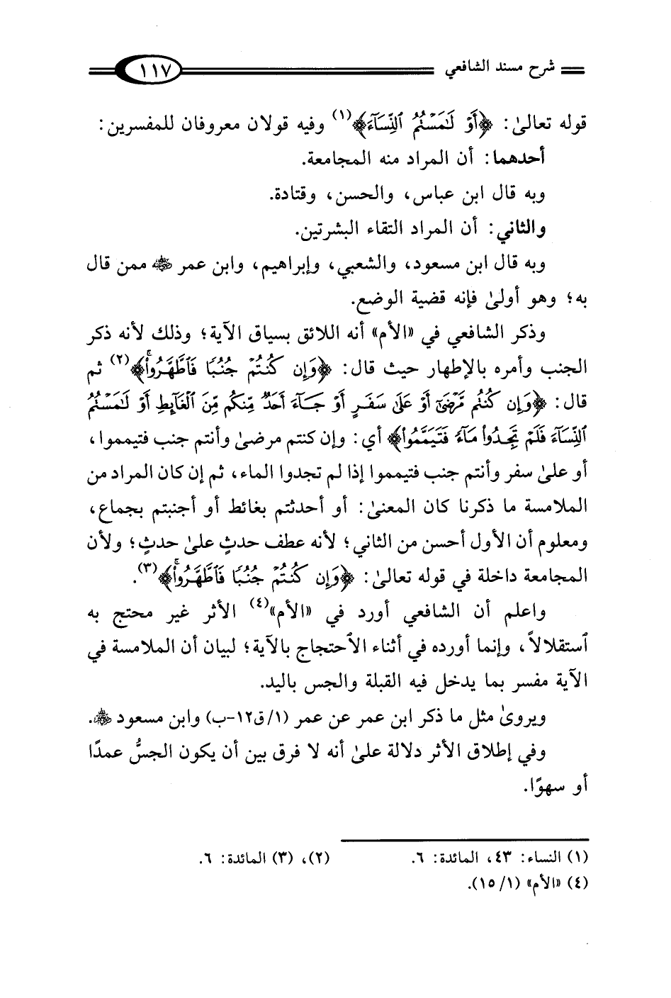 وذكر الشافعي في "الأم" أنه اللائق بسياق الآية؛ وذلك لأنه ذكر الجنب وأمره بالإطهار حيث قال: {وَإِنْ كُنْتُمْ جُنُبًا فَاطَّهَّرُوا} (¬2) ثم قال: {وَإِنْ كُنْتُمْ مَرْضَى أَوْ عَلَى سَفَرٍ أَوْ جَاءَ أَحَدٌ مِنْكُمْ مِنَ الْغَائِطِ أَوْ لَامَسْتُمُ النِّسَاءَ فَلَمْ تَجِدُوا مَاءً فَتَيَمَّمُوا} أي: وإن كنتم مرضى وأنتم جنب فتيمموا، أو على سفر وأنتم جنب فتيمموا إذا لم تجدوا الماء، ثم إن كان المراد من الملامسة ما ذكرنا كان المعنى: أو أحدثتم بغائط أو أجنبتم بجماع، ومعلوم أن الأول أحسن من الثاني؛ لأنه عطف حدثٍ على حدثٍ؛ ولأن المجامعة داخلة في قوله تعالى: {وَإِنْ كُنْتُمْ جُنُبًا فَاطَّهَّرُوا} (¬3).