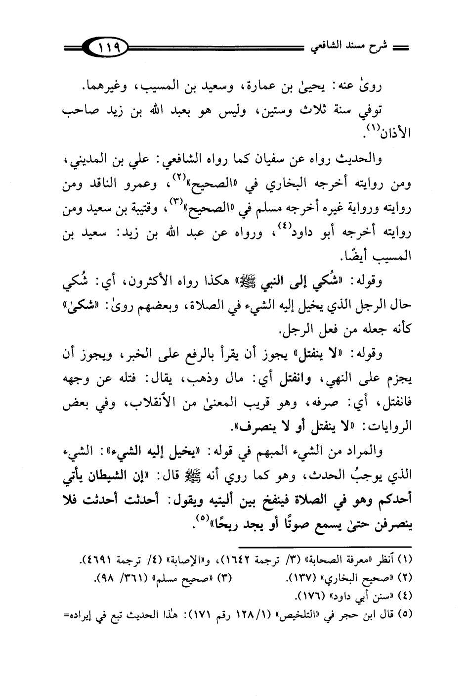 والحديث رواه عن سفيان كما رواه الشافعي: علي بن المديني، ومن روايته أخرجه البخاري في "الصحيح" (¬2)، وعمرو الناقد ومن روايته ورواية غيره أخرجه مسلم في "الصحيح" (¬3)، وقتيبة بن سعيد ومن روايته أخرجه أبو داود (¬4)، ورواه عن عبد الله بن زيد: سعيد بن المسيب أيضًا.