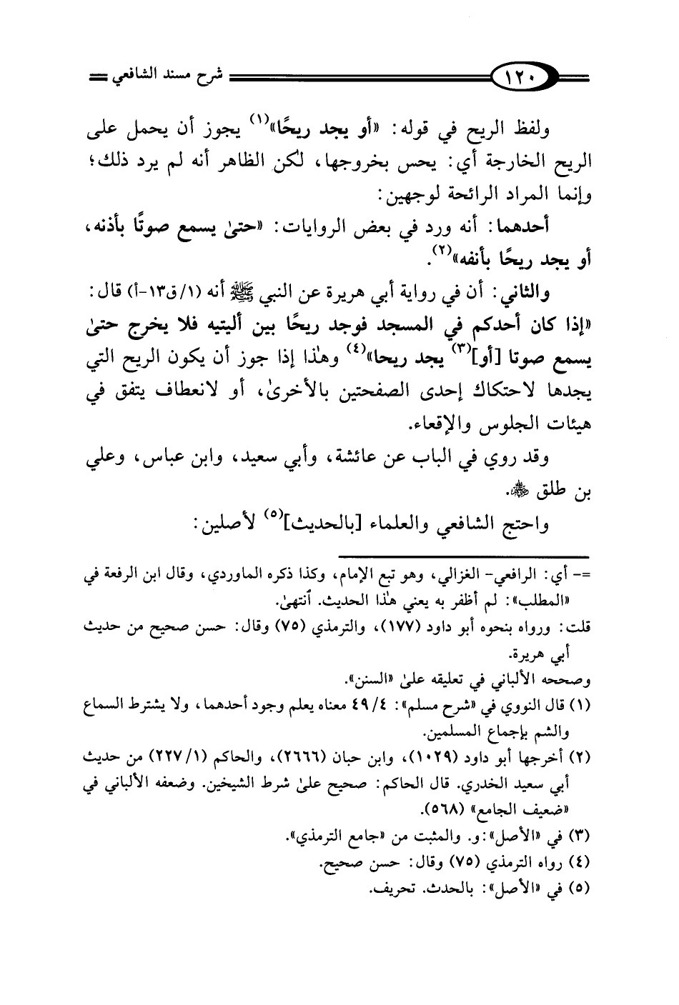 والثاني: أن في رواية أبي هريرة عن النبي - صلى الله عليه وسلم - أنه (1/ ق 13 - أ) قال: "إذا كان أحدكم في المسجد فوجد ريحًا بين أليتيه فلا يخرج حتى يسمع صوتا [أو] (¬3) يجد ريحا" (¬4) وهذا إذا جوز أن يكون الريح التي يجدها لاحتكاك إحدى الصفحتين بالأخرى، أو لانعطاف يتفق في هيئات الجلوس والإقعاء.